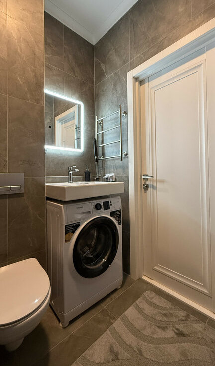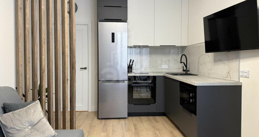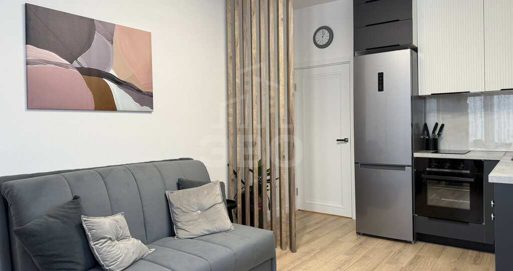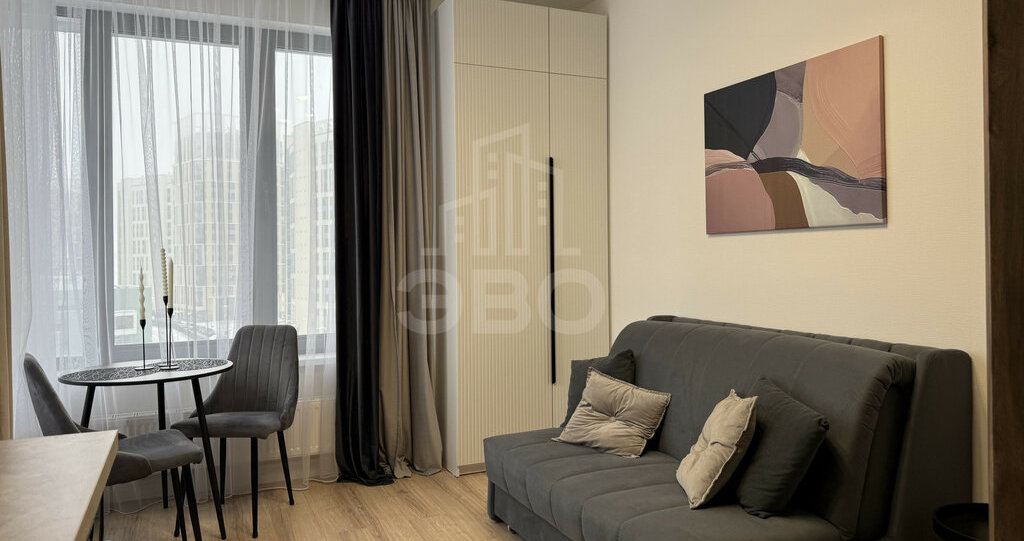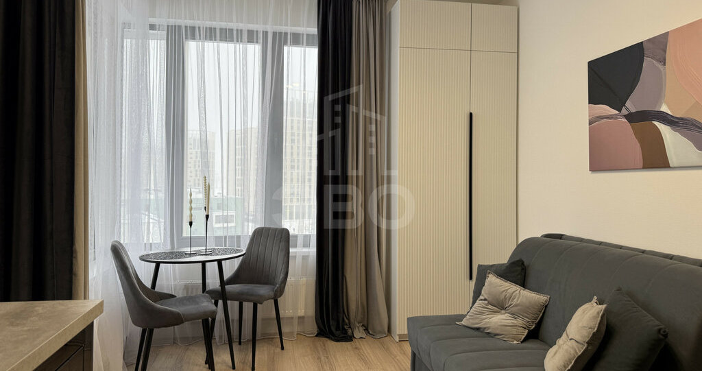 Студия полностью меблирована и укомплектована всей необходимой мебелью и техникой — есть всё для комфортного проживания.