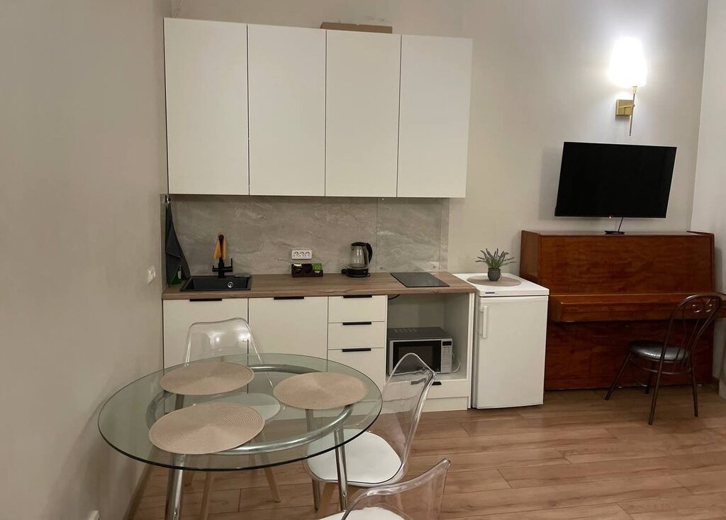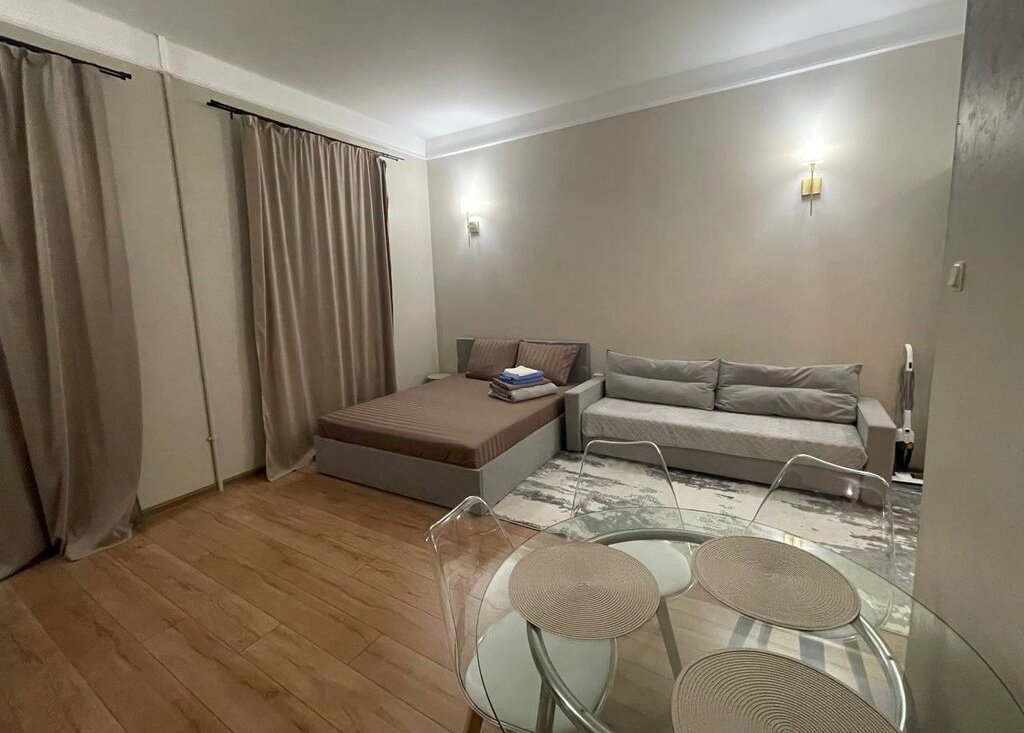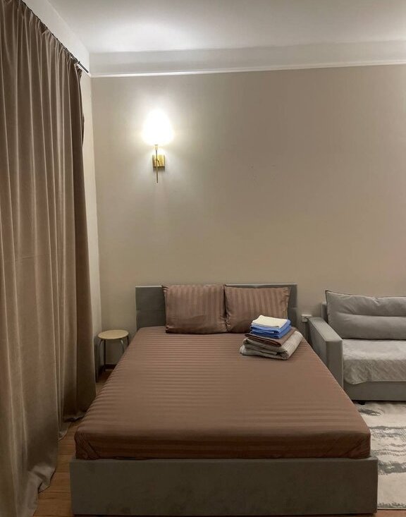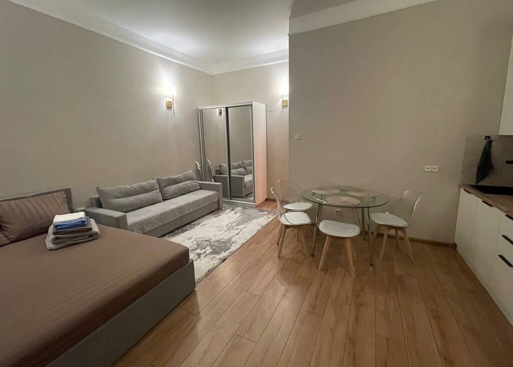 Очень уютная квартира-студия. Полностью оборудована всем необходимым для комфортного проживания. Окна во двор. Рядом много магазинов, торговых и развлекательных центров, кафе, ресторанов. Вы в самом центре города.