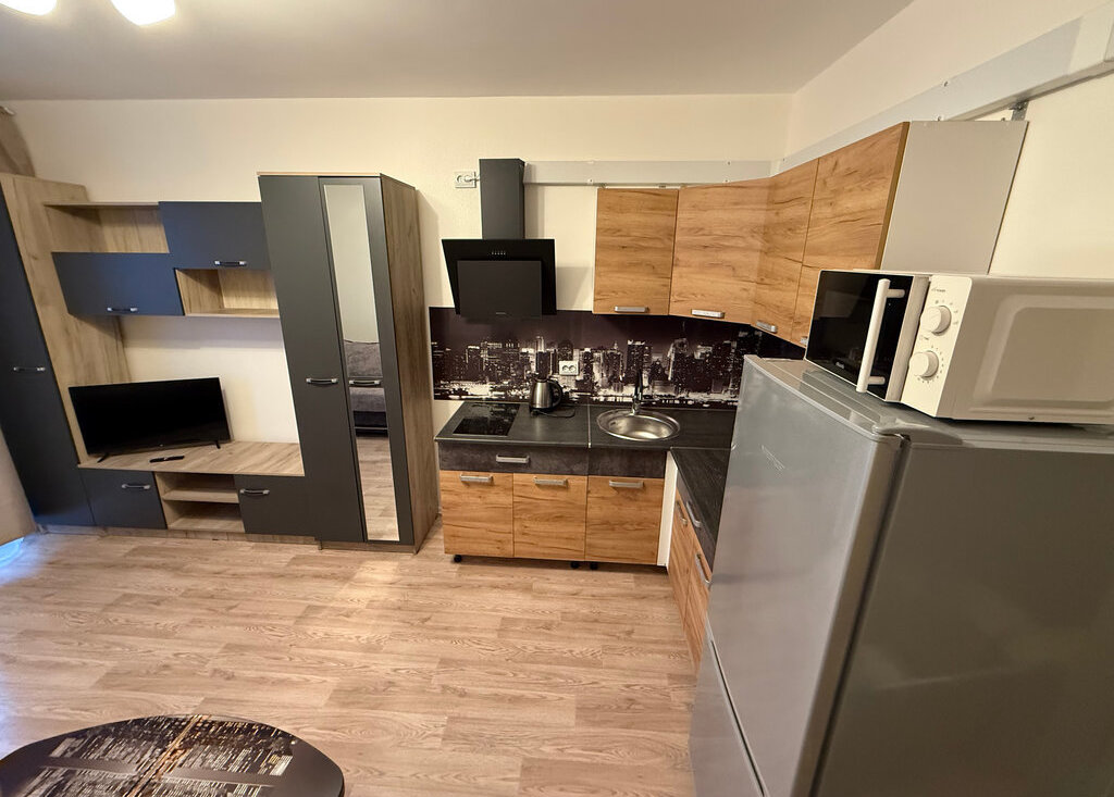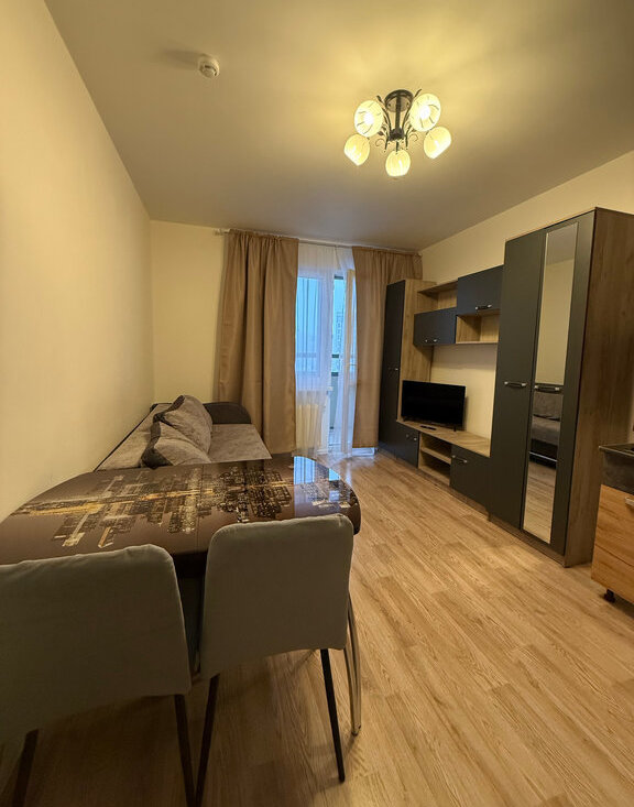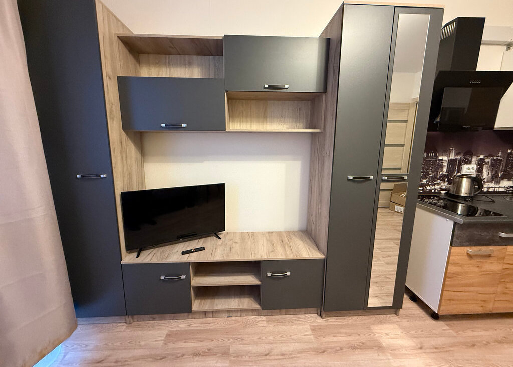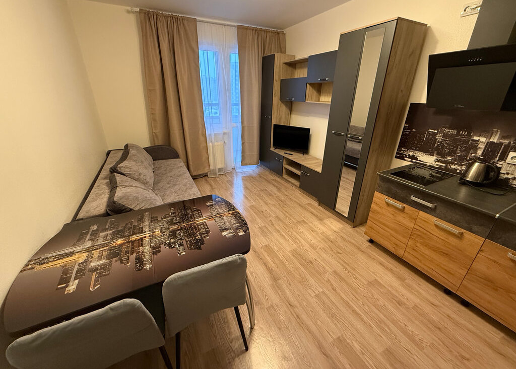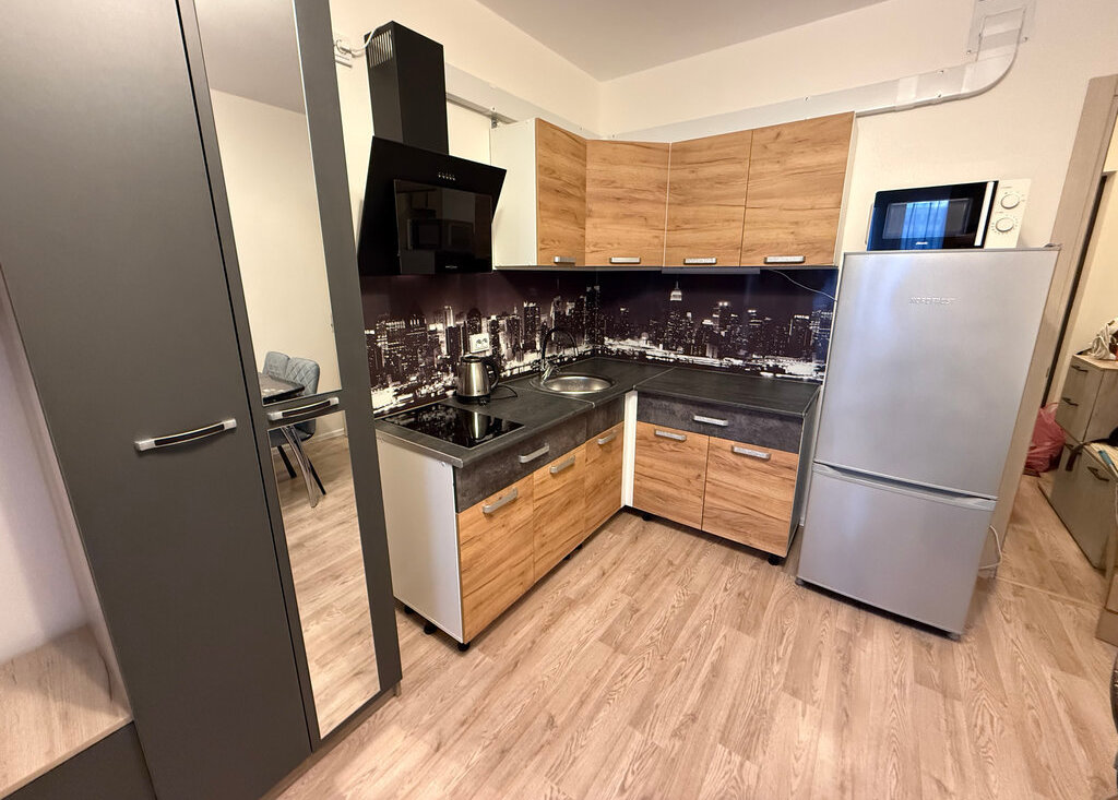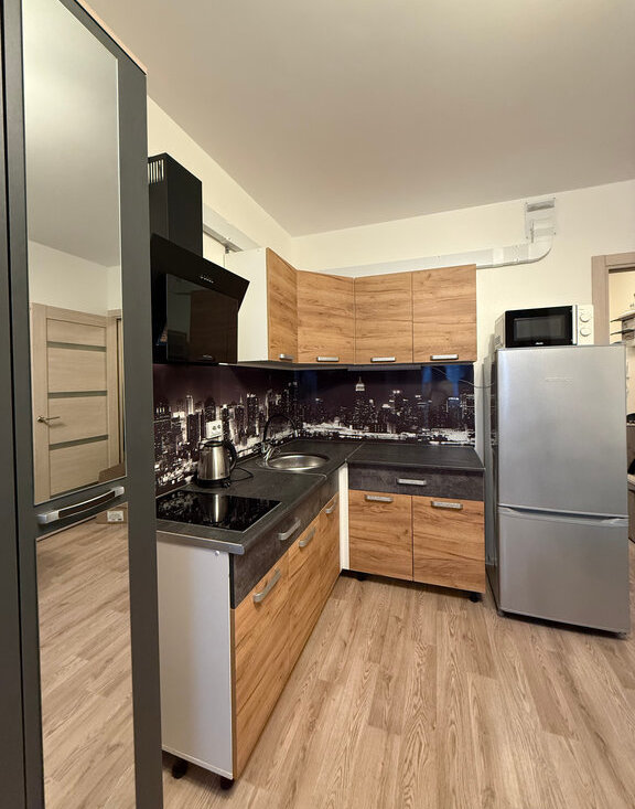 В квартире есть все необходимое: мебель и техника. Оборудованная кухня, столы и стулья, холодильник, микроволновка, стиральная машина, шкаф в прихожей, раскладной диван.