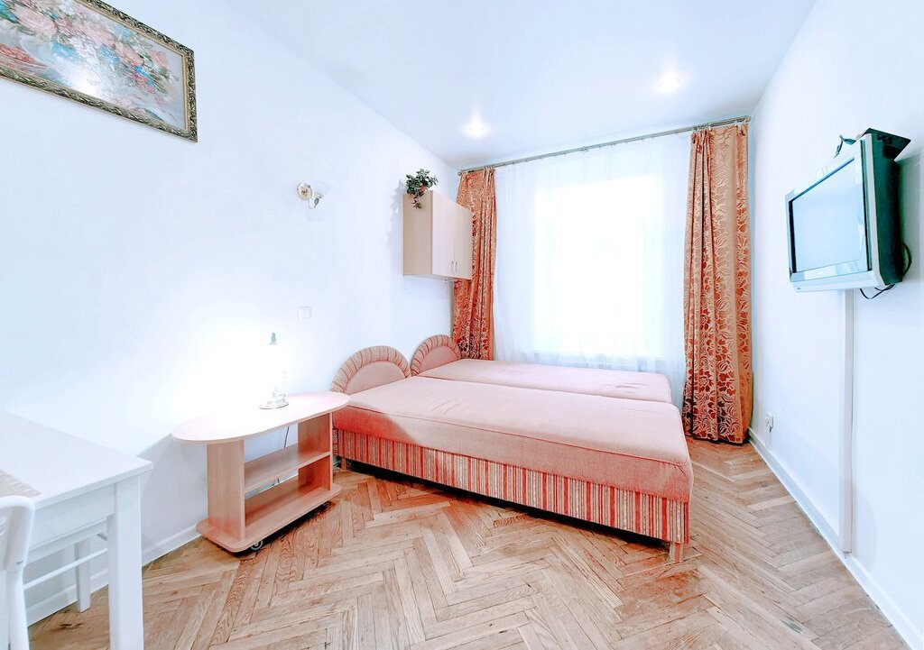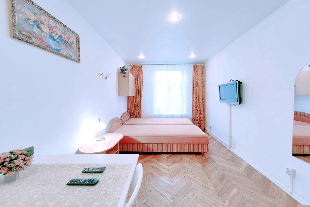 -Общая площадь 26 м. 2-х спальная кровать, шкаф, стол, стулья, тумбочка, TV.