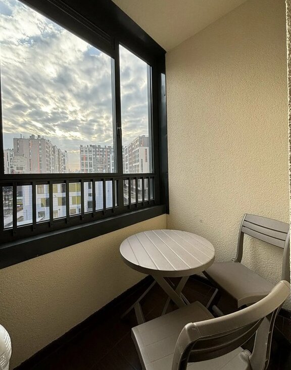 На застеклённой лоджии расположен кофейный столик и удобные стулья.