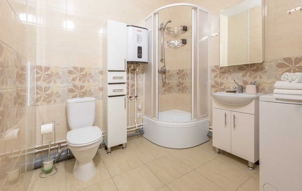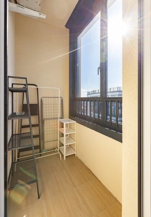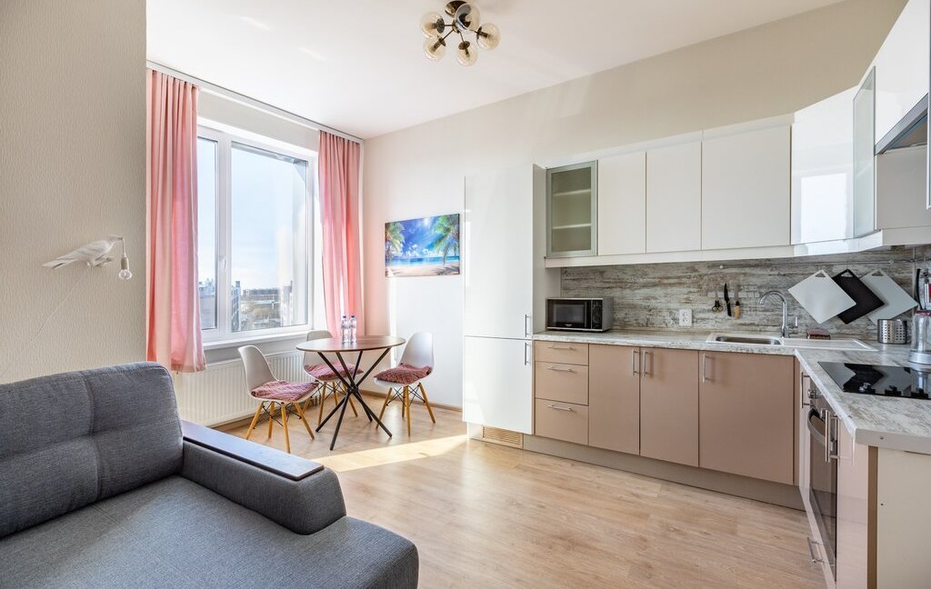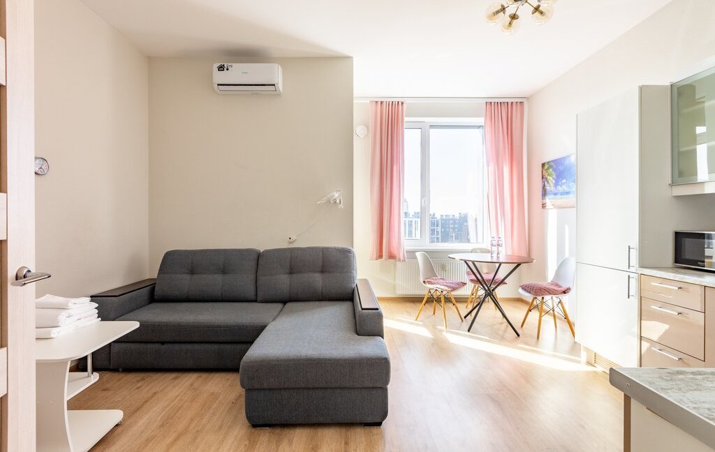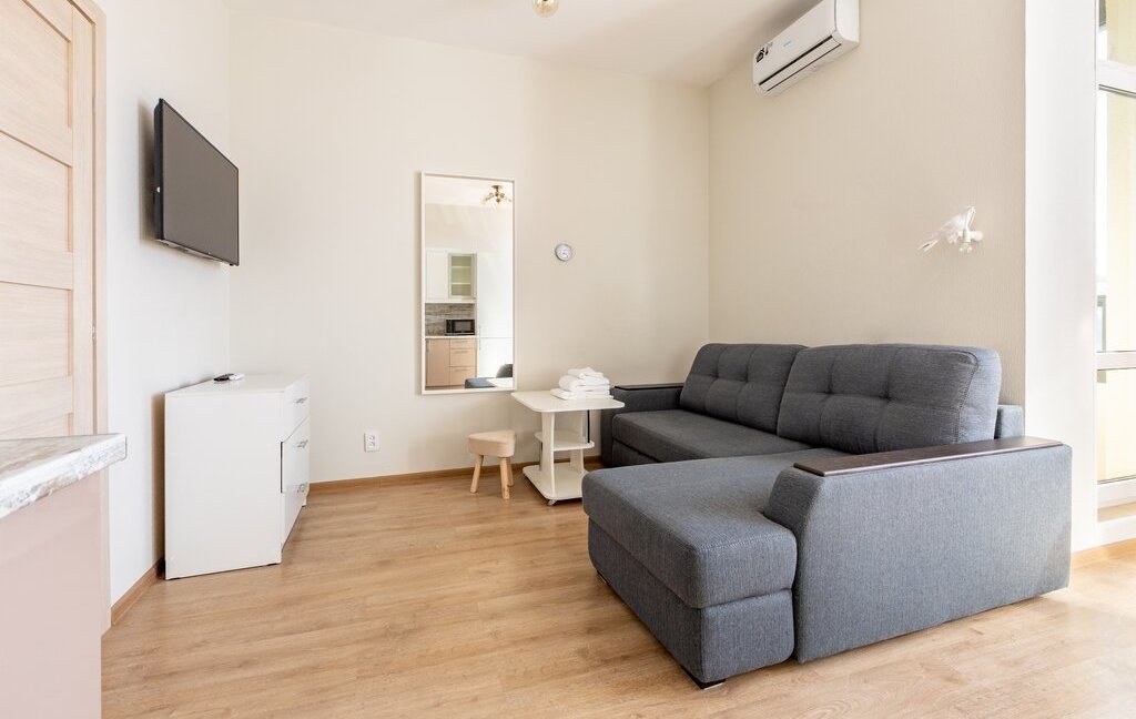 Внутри — всё для удобства и уюта. Просторная зона отдыха с диваном и ТВ, обеденная зона у окна, полноценная кухня с техникой и посудой. Большие окна наполняют пространство светом, создавая приятную атмосферу. Есть кондиционер и стиральная машина, что делает проживание ещё комфортнее.
