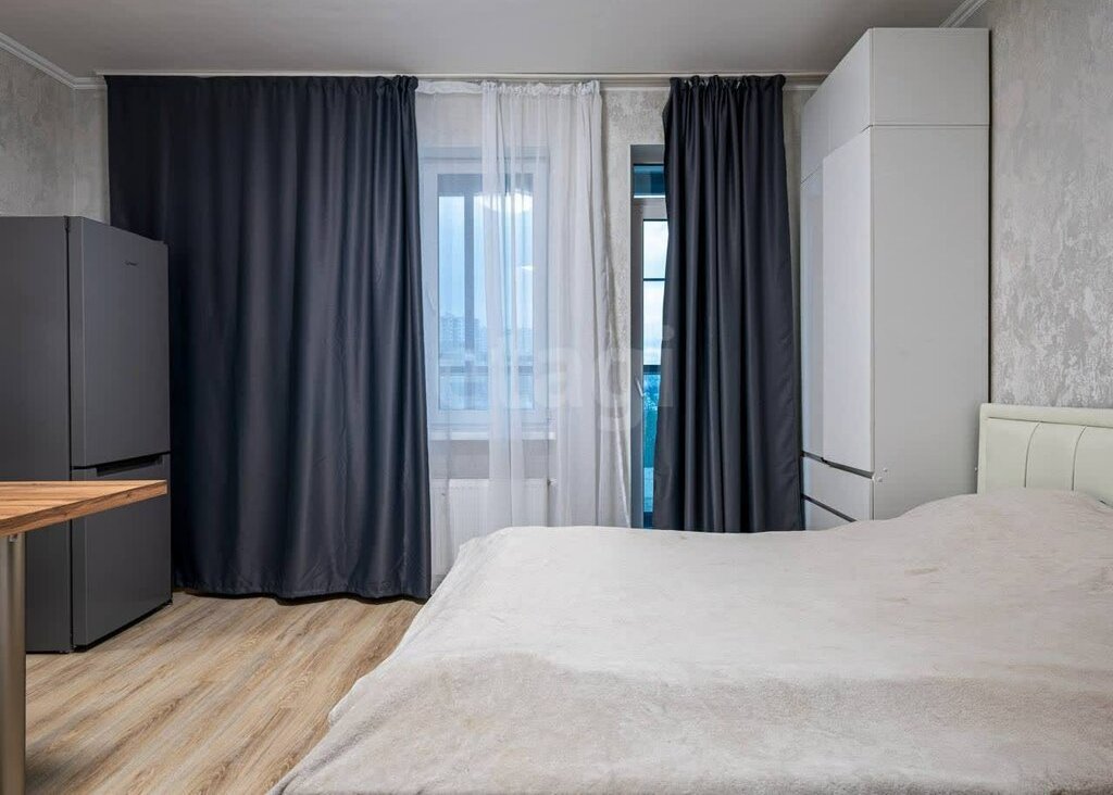 Квартира оформлена в современном минималистичном стиле с использованием нейтральных тонов. Просторная гостиная сочетает в себе комфорт и функциональность, двухспальная кровать, вместительный шкаф для хранения.