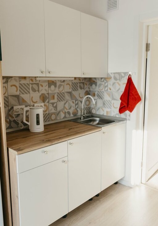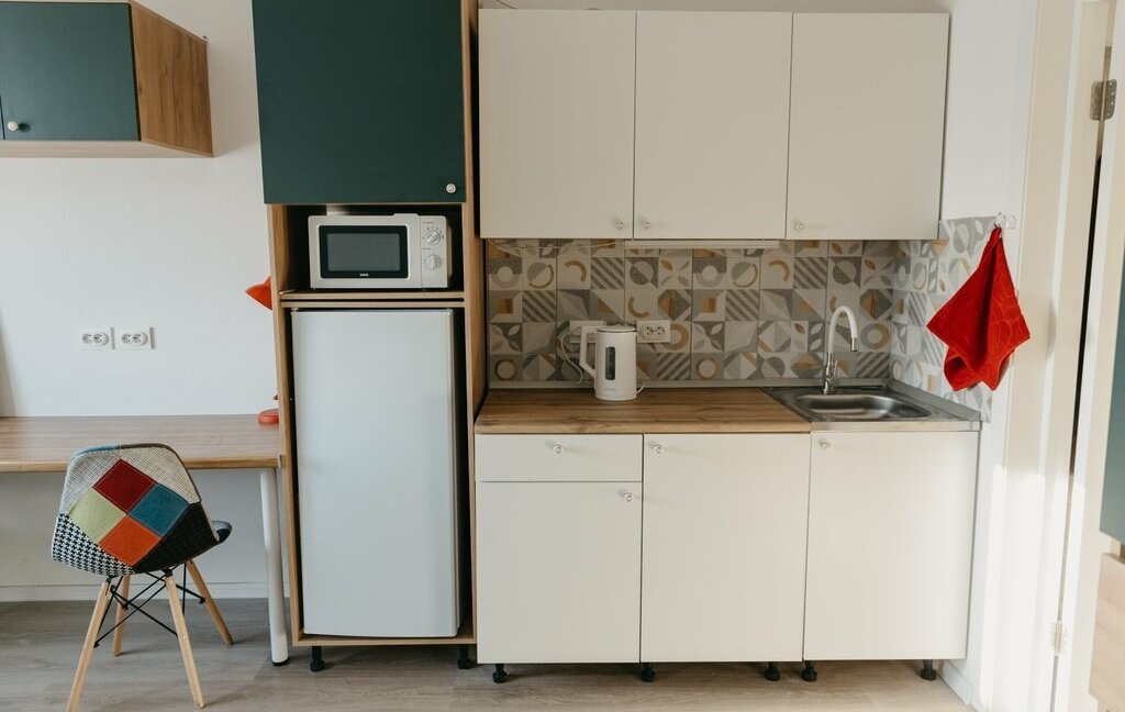 Есть плита индукционная однокомфорочная, убирается в шкаф при желании.