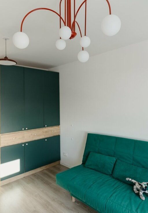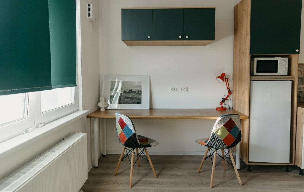 Мы постарались сделать обстановку квартиры яркой, но уютной, с оригинальными деталями. Стол длинный и совмещает две функции - рабочую и кухонную. На него удобно поставить компьютер или ноутбук.