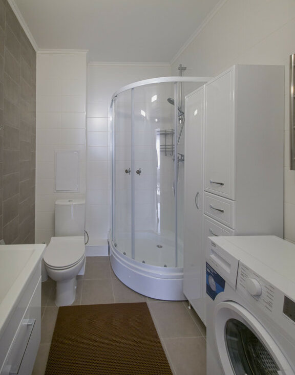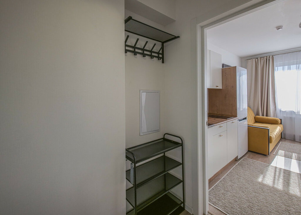 Есть всё для комфортной жизни — вместительный трехсекционный шкаф с ящиками, шкаф, стиральная машина, шкафчик в санузле, микроволновая печь, чайник, полноценный холодильник, обеденный стол и стулья.