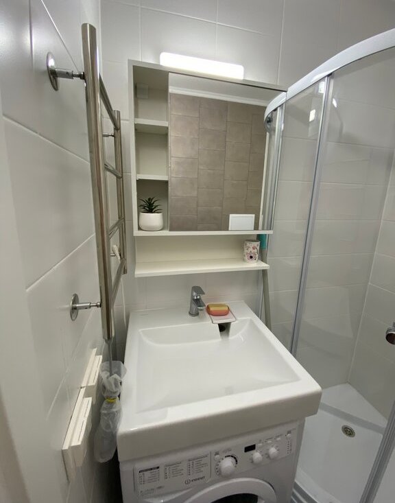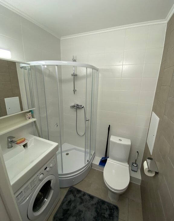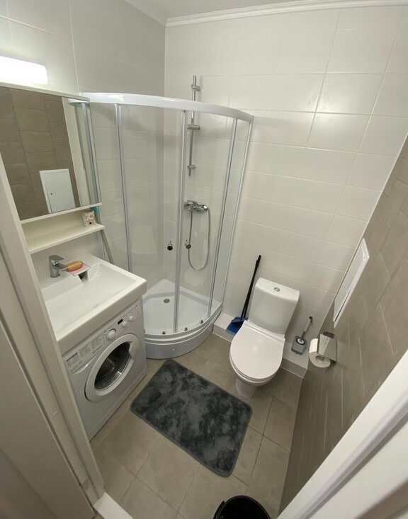 В санузле установлена душевая кабина и стиральная машина.