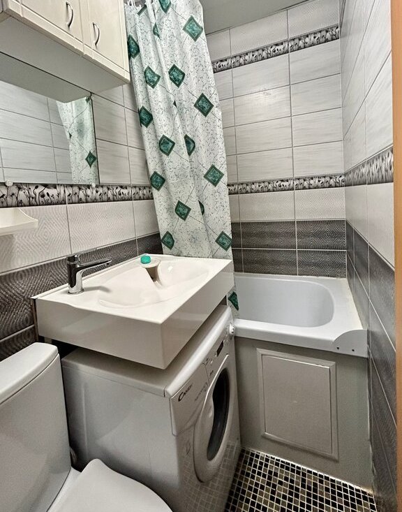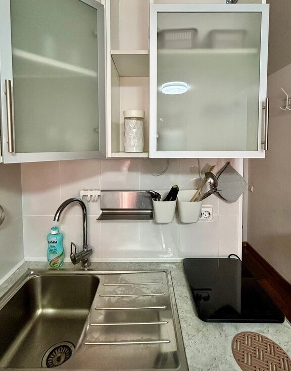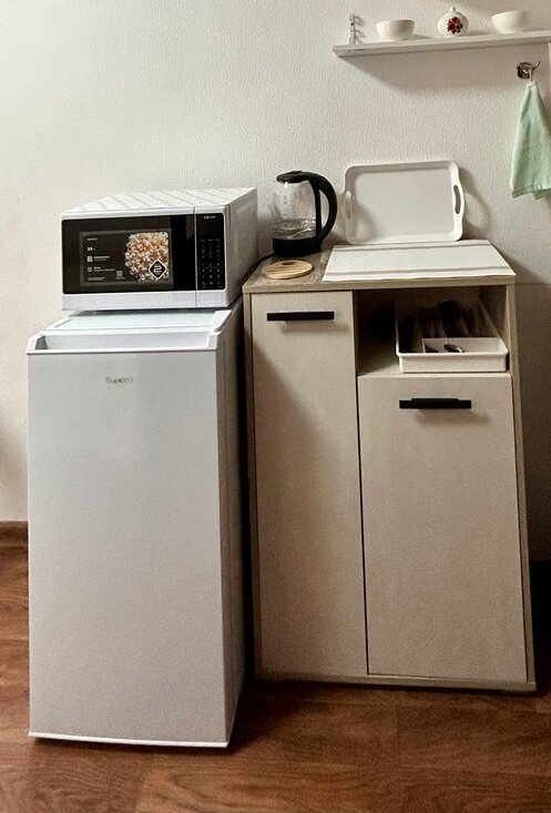 В квартире новая бытовая техника: холодильник, микроволновая печь, чайник, индукционная электроплита, ручной пылесос, утюг. Есть стиральная машина на 4 кг, телевизор и КОНДИЦИОНЕР!