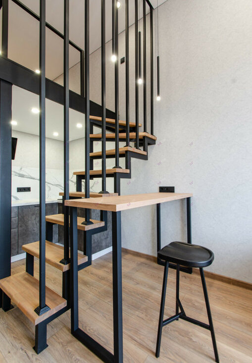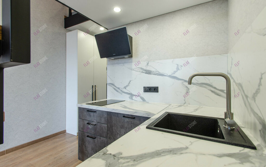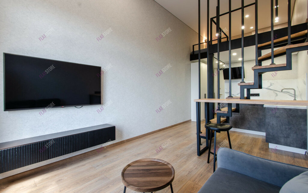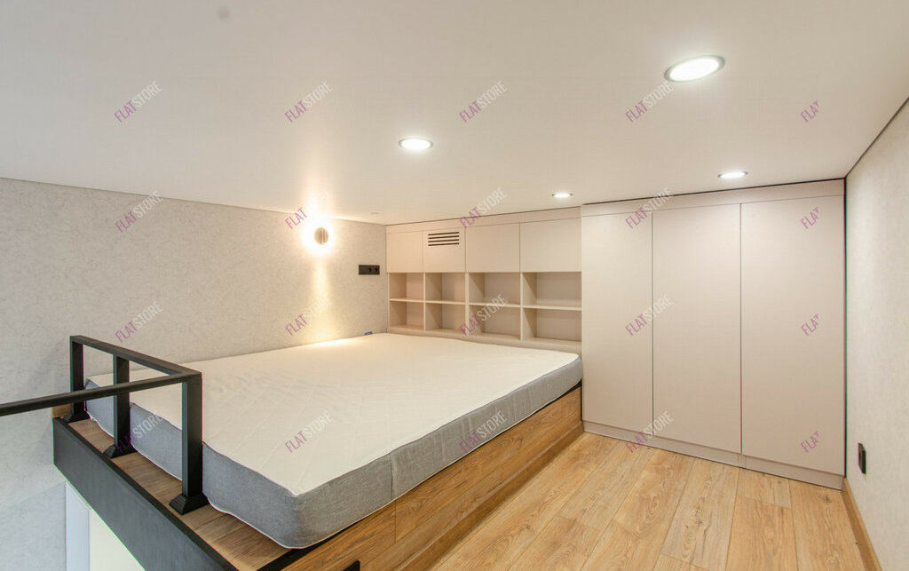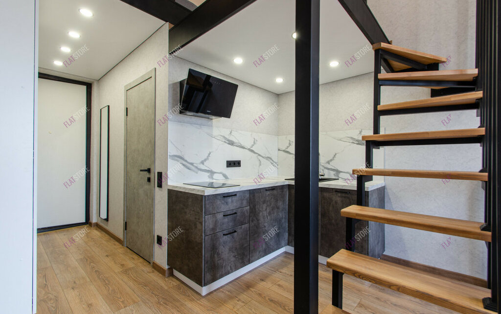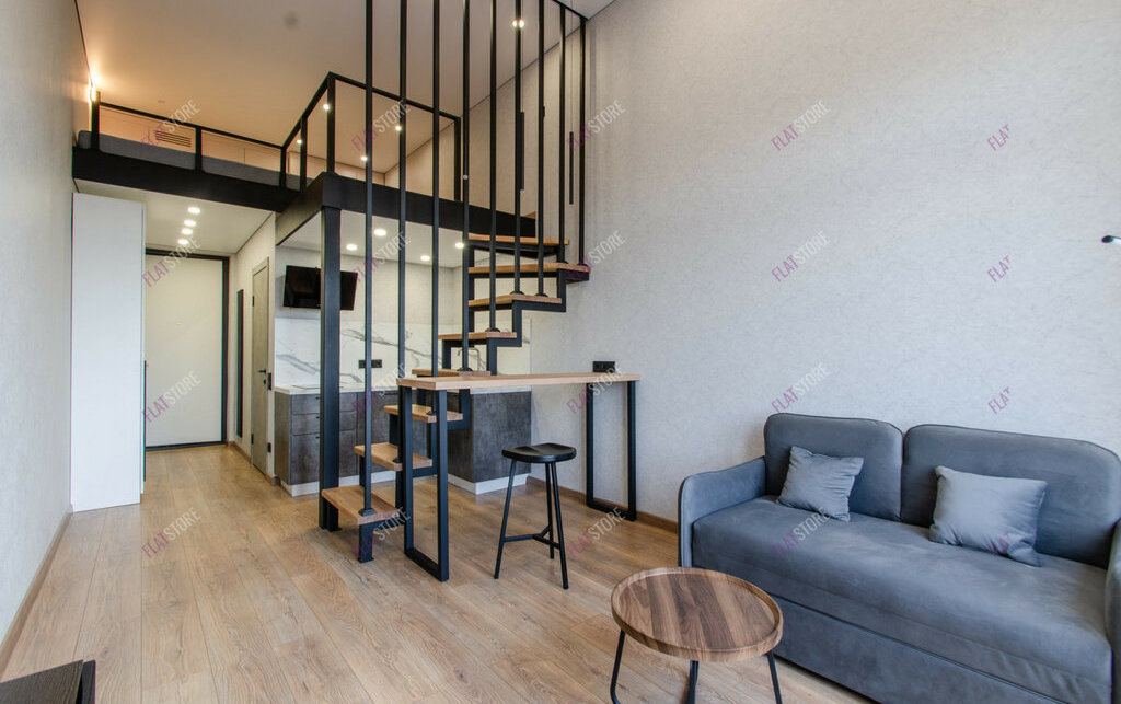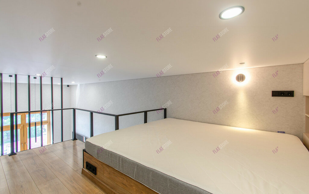 Планировка удобная и имеет зонирование: гостевая зона, кухонное пространство, спальное место на втором уровне.