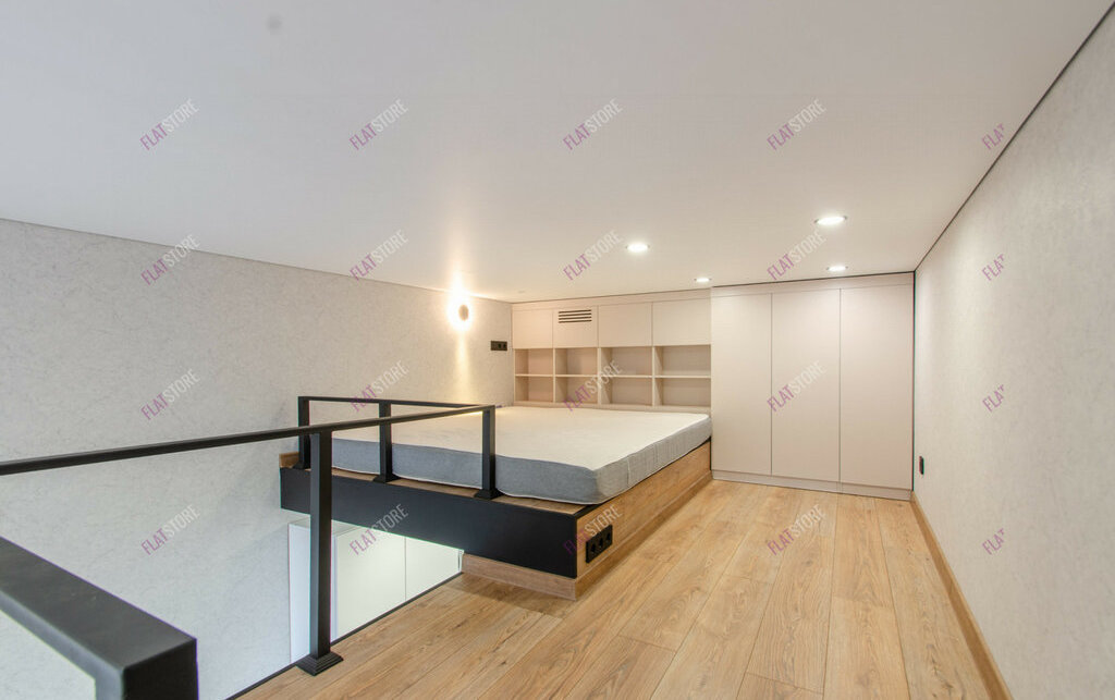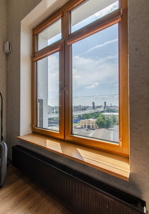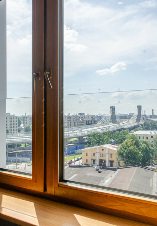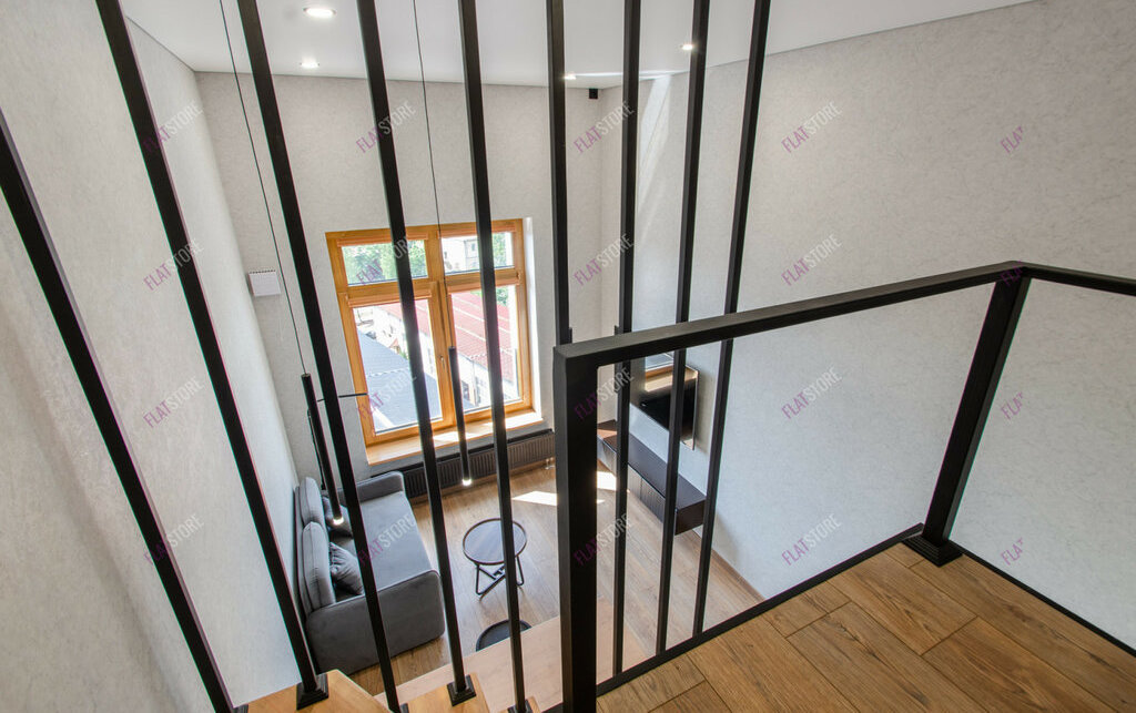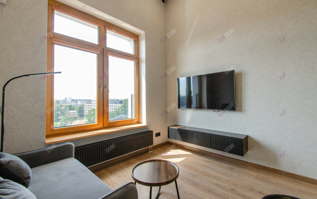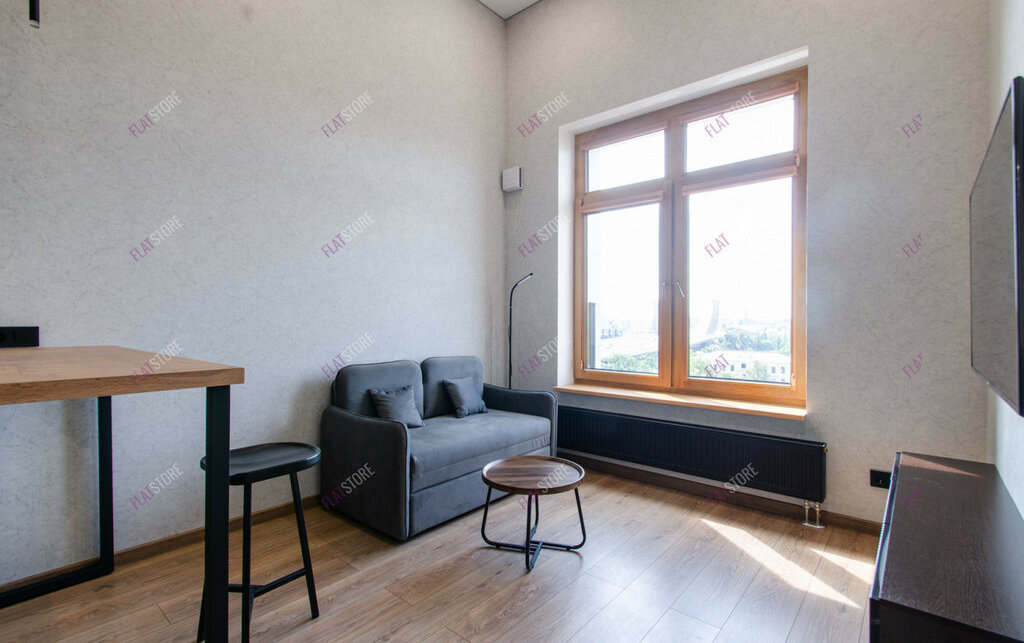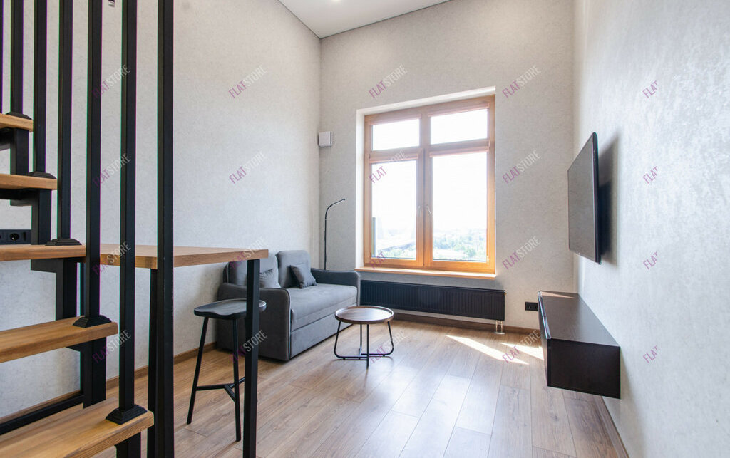 Особенная студия с высокими потолками и панорамным видом из окна.