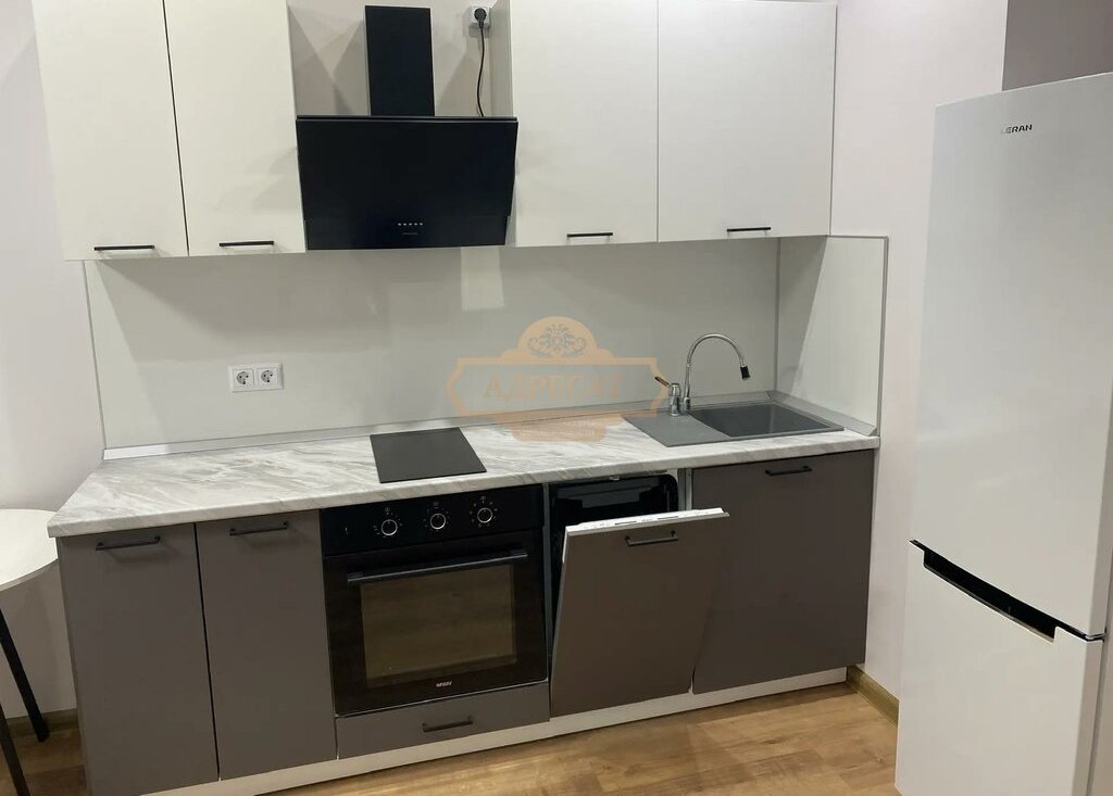 Кухня оборудована посудомоечной машиной, большой холодильник.