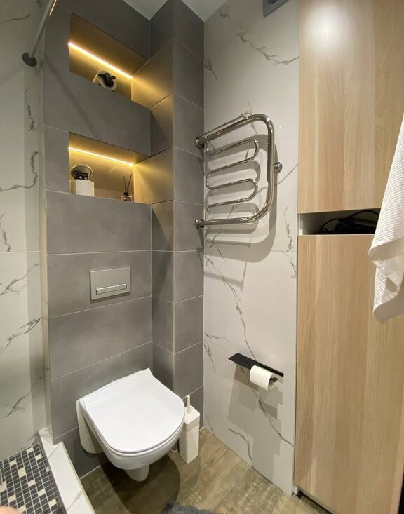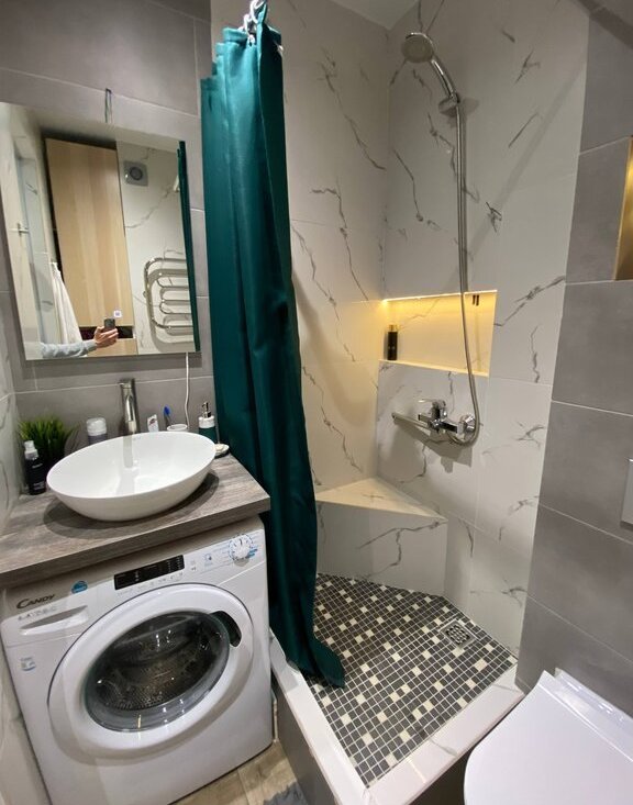 Делал ремонт 3 года назад для себя, поэтому материалы качественные, а дизайн продуман до мелочей: от мягкого света и сиденья в душевой, до холодильника на уровне глаз, а не колен)