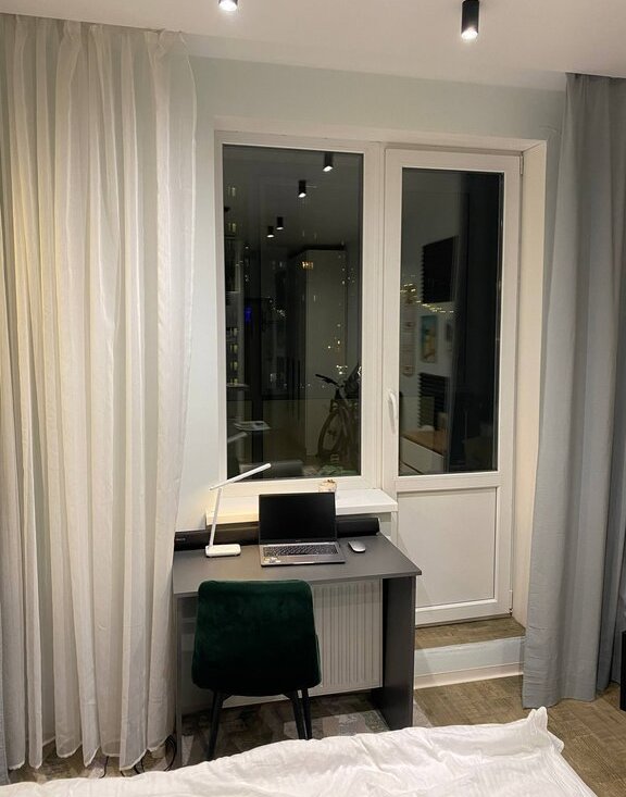 Зонирование: кухня, спальня, рабочая зона. В квартире много света и пастельные тона дают ощущение уюта в любую погоду