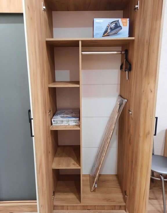 Есть посуда, чайник, утюг, гладильная доска, сушилка для белья, постельные принадлежности.
