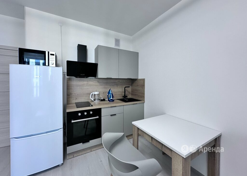 Техника: холодильник, электрическая варочная панель, духовой шкаф, микроволновая печь, вытяжка, чайник, телевизор, пылесос, утюг