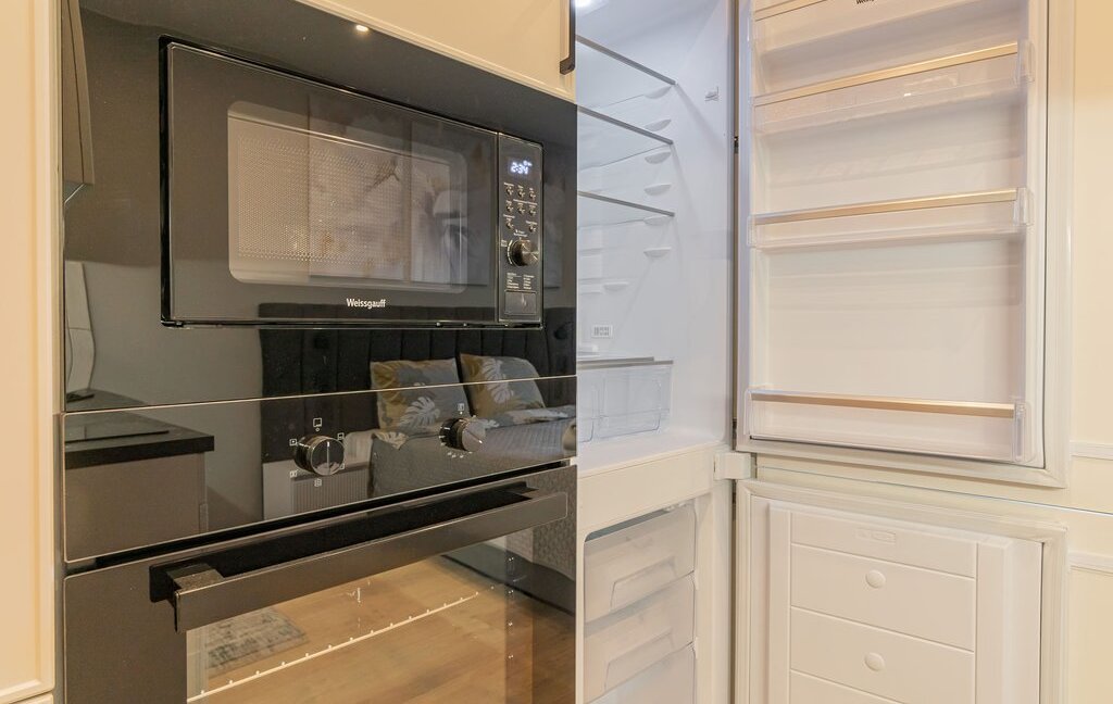 - -обеденная зона (большой холодильник, чайник, микроволновка, плита, столовая группа, посуда на 2 персоны, стол со стульями, посудомойка , духовка)