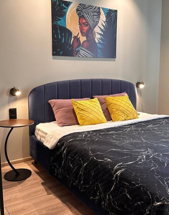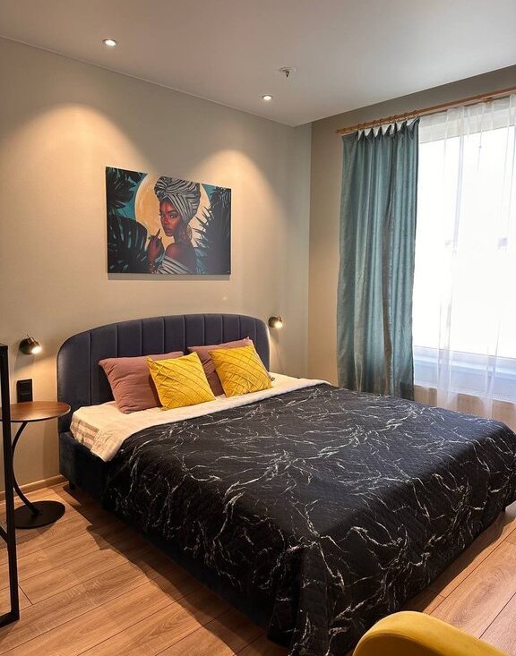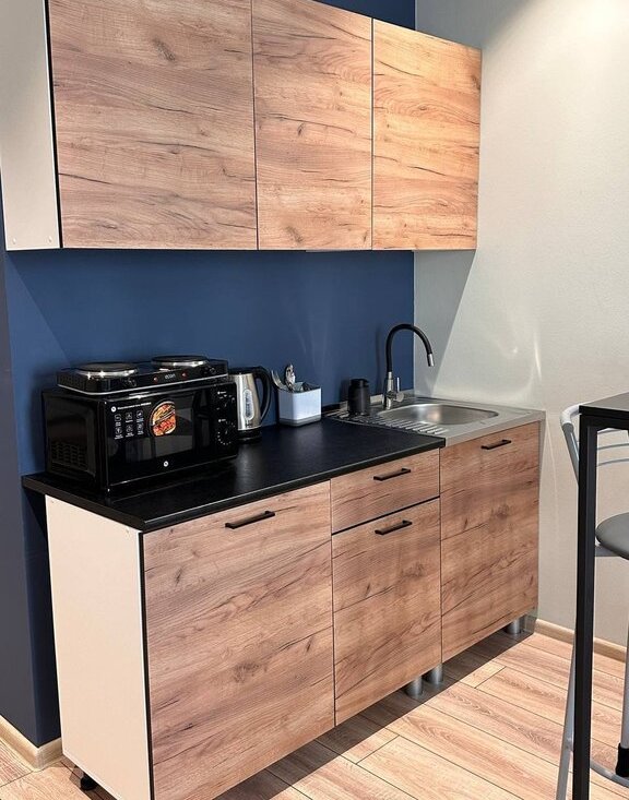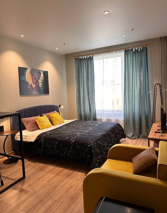 Студия выполнена в современном стиле с качественным евроремонтом. В комнате и на кухне есть вся необходимая мебель для комфортного проживания.