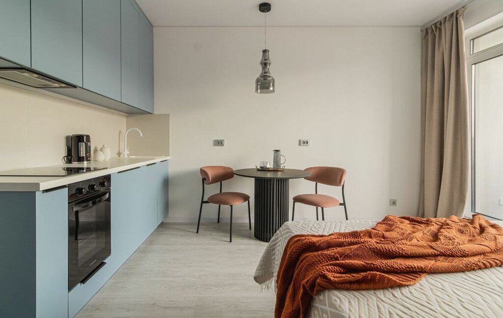 Студия с современным дизайнерским ремонтом сдается в первый раз.