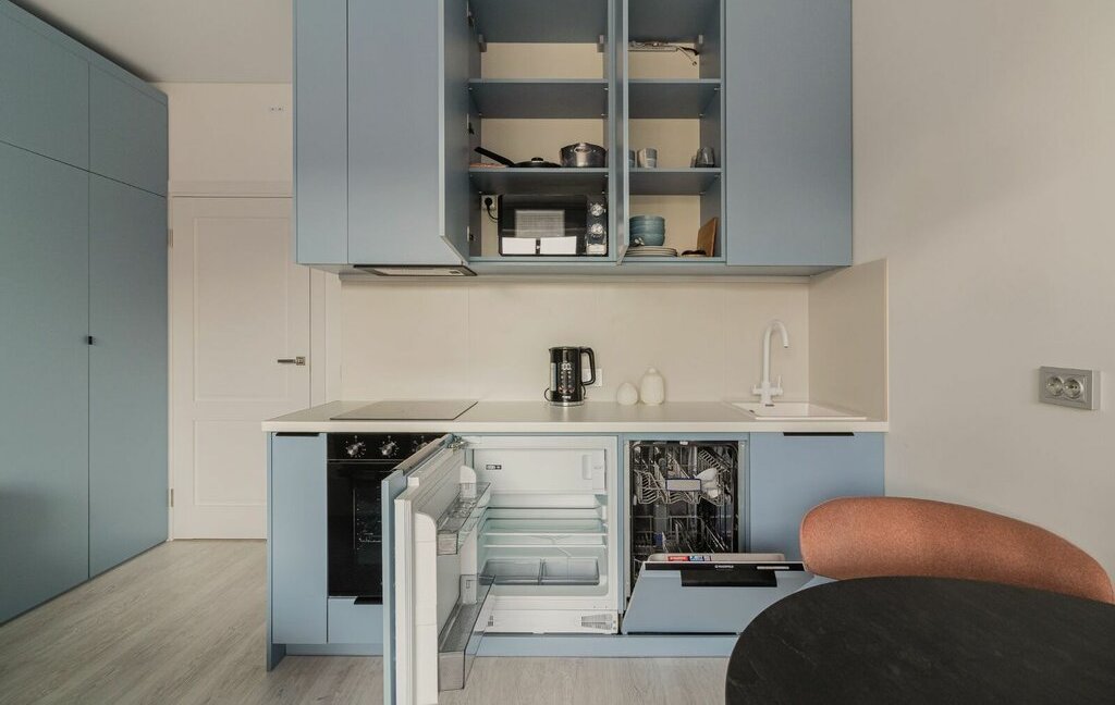 кухня c духовкой, варочной панелью, посудомоечной машиной, встроенным холодильником, вытяжкой.