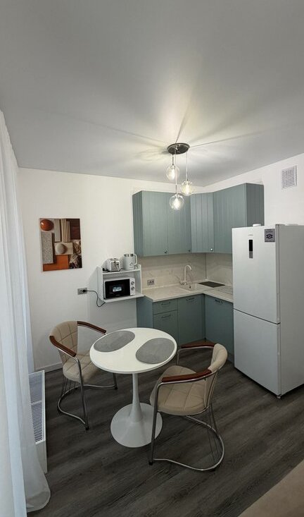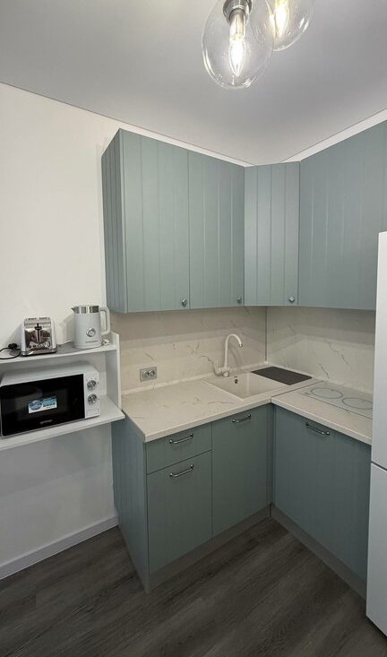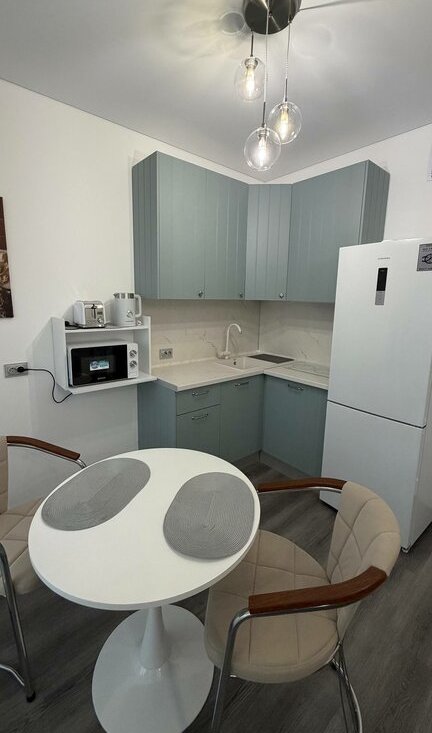 Кухня: сенсорная варочная панель, вытяжка, холодильник, микроволновая печь, электрический чайник.