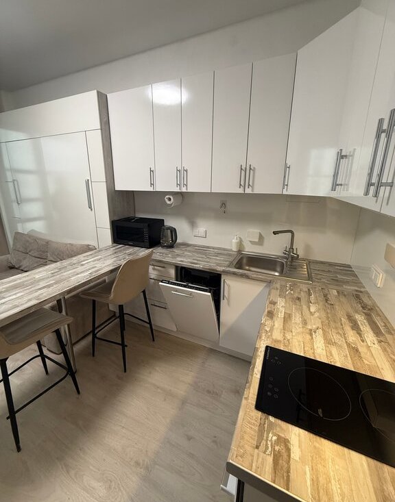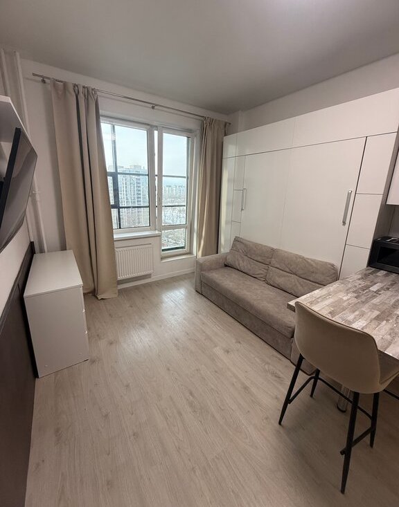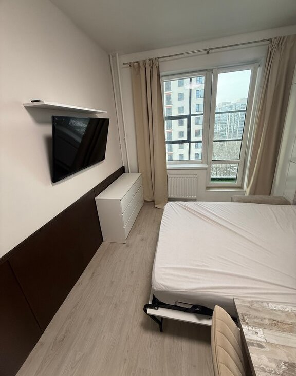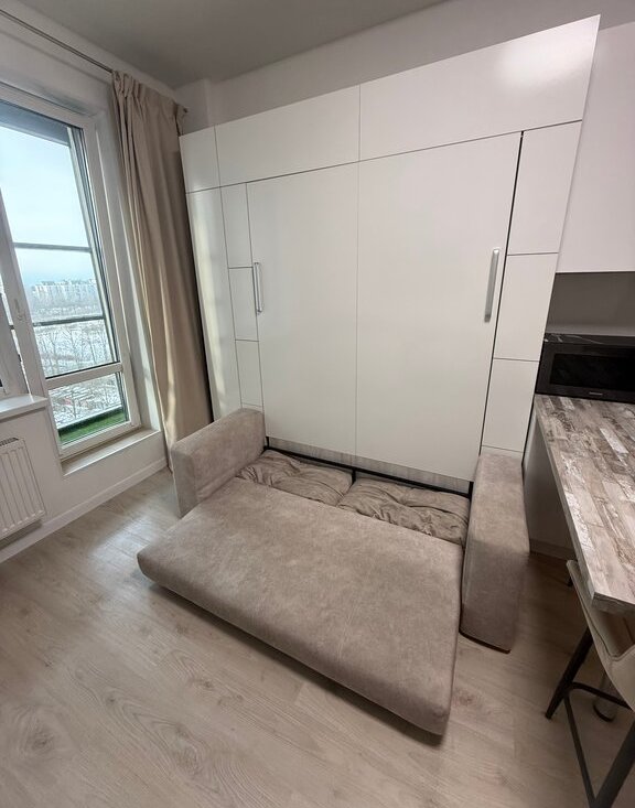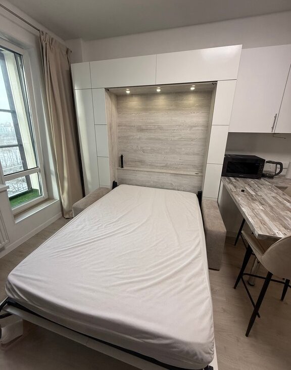 Квартира оборудована раскладывающейся кроватью/диваном из шкафа с большим количеством полок и подсветкой, просторная лоджия около 6 м², кухня с барной стойкой.