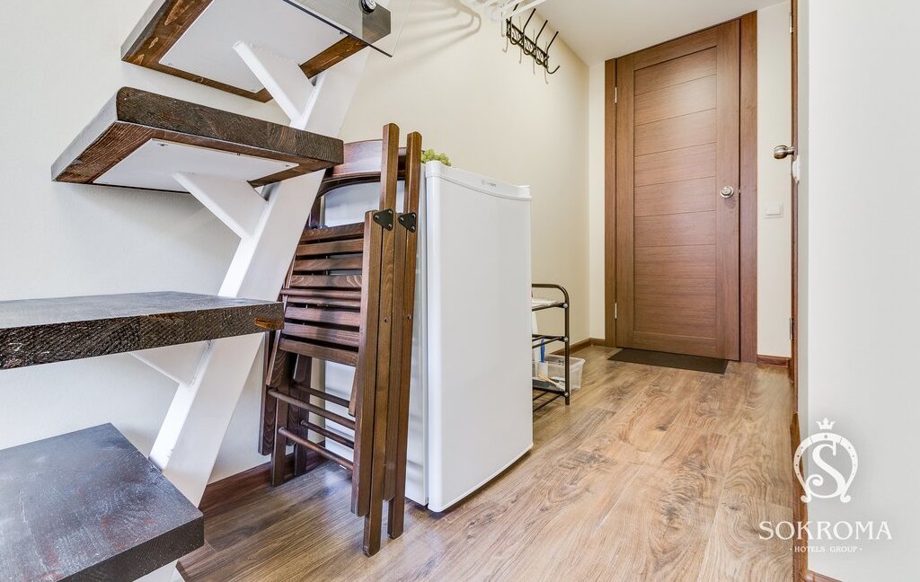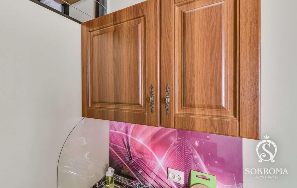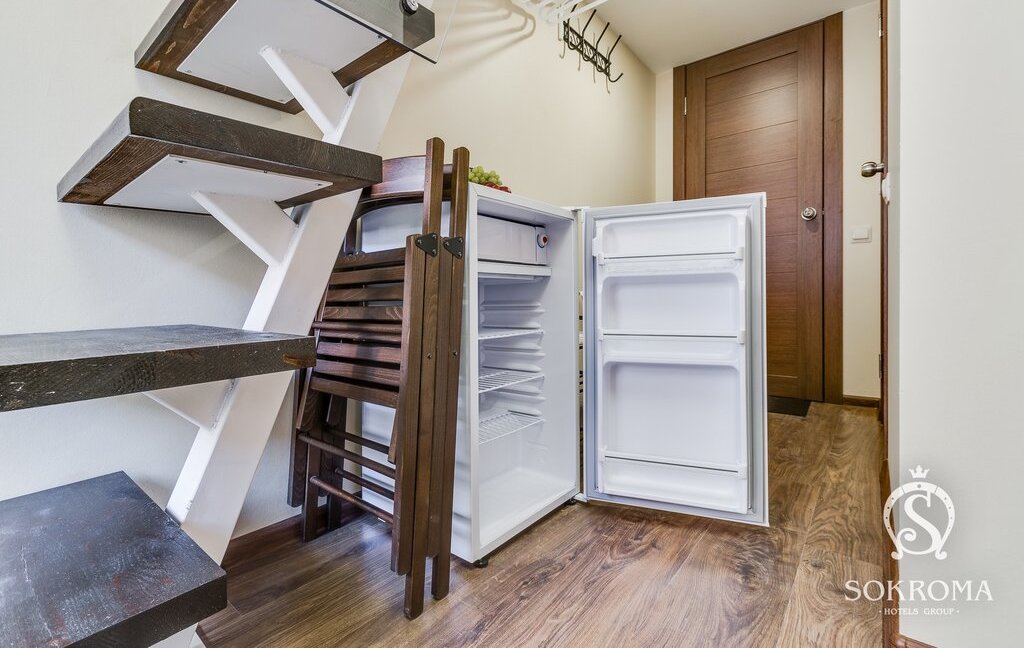 В студии чайник, индукционная плита ,холодильник. На общей территории расположена гладильная доска, стиральная машина, микроволновая печь, кулер - доступные для пользования