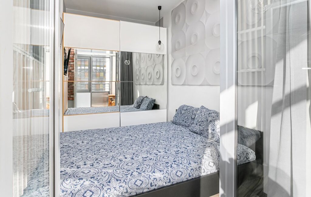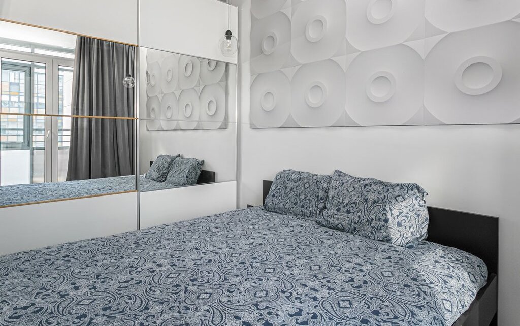 Организовано полноценное спальное место (двуспальная кровать 160х200 см), гостевой диван, функциональные зоны для хранения.