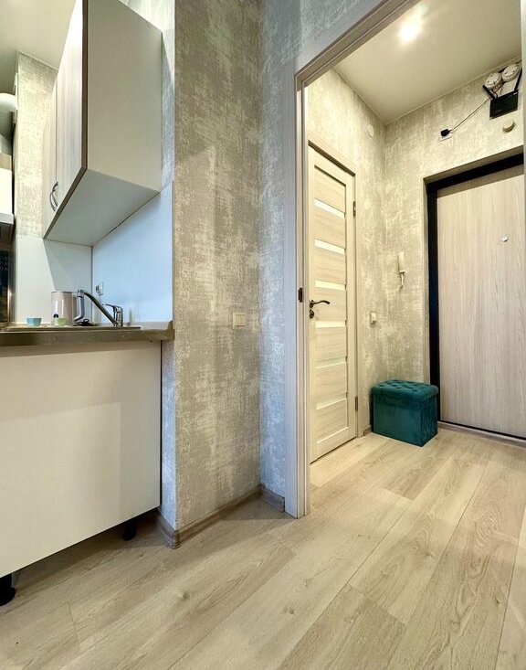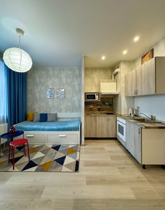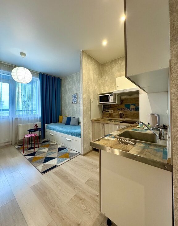 Сдается уютная студия в стиле "Контемпорари" в современном доме 2020 года постройки на длительный срок. Квартира занимает 22.8 кв. м и расположена на 9 этаже 18-этажного монолитного здания. Высота потолков составляет 2.75 метра, а окна выходят во двор, что обеспечивает тишину и комфорт.