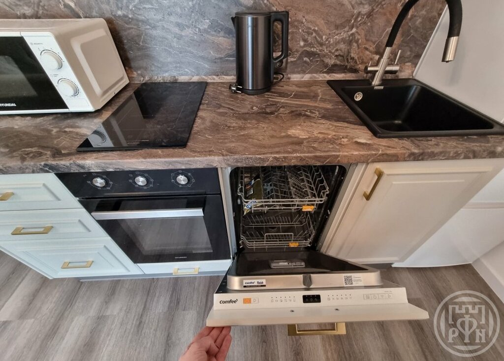 - посудомоечная машина, холодильник, стиральная машина, эл чайник, микроволновка, духовой шкаф, фильтр для воды, утюг, смарт TV, интернет, современная посуда, удобный диван с независимым пружинным блоком раскладывается в полноценное спальное место.