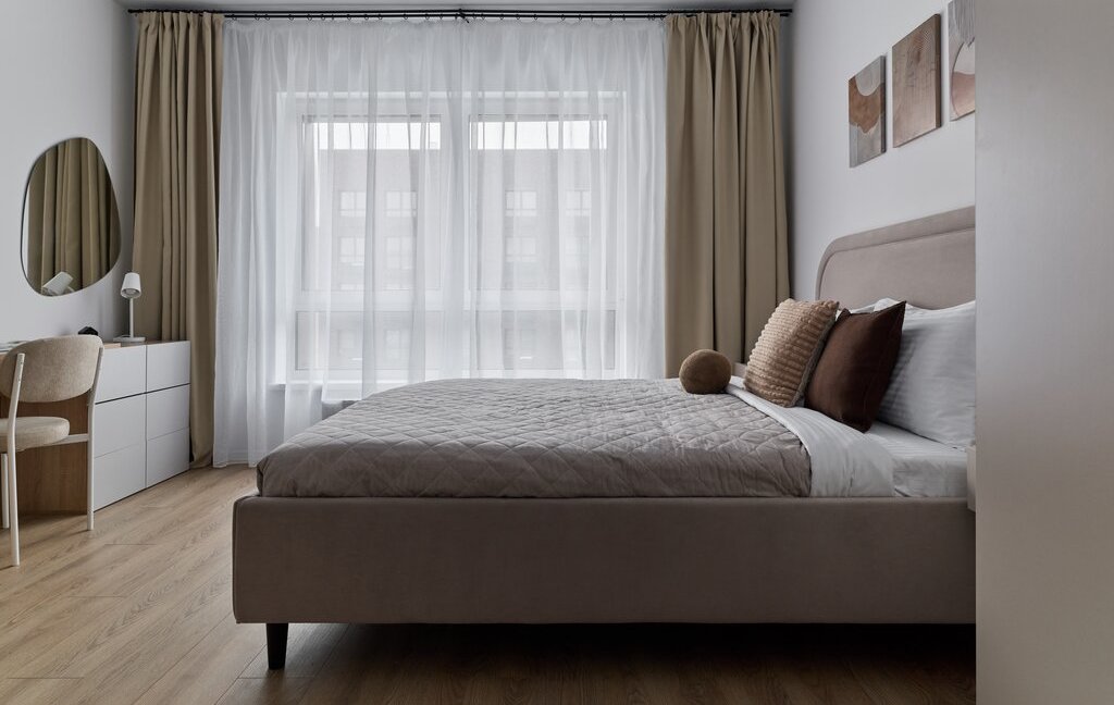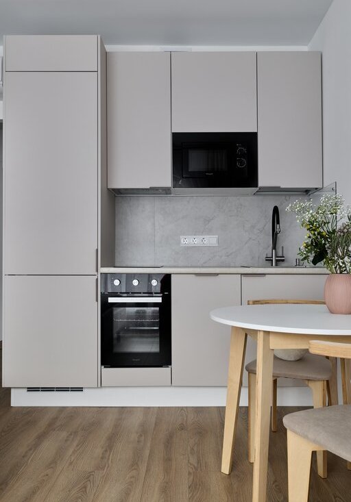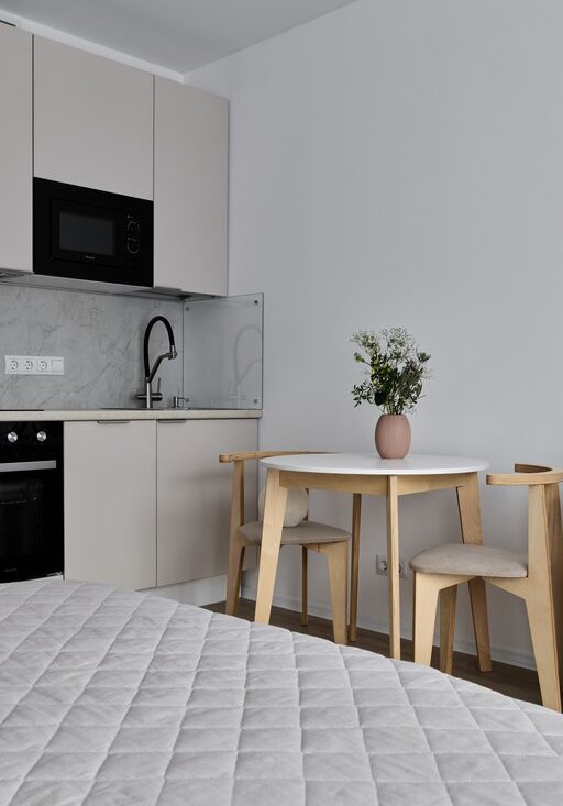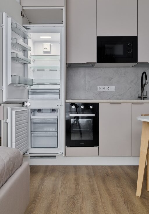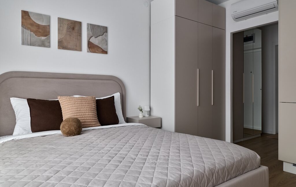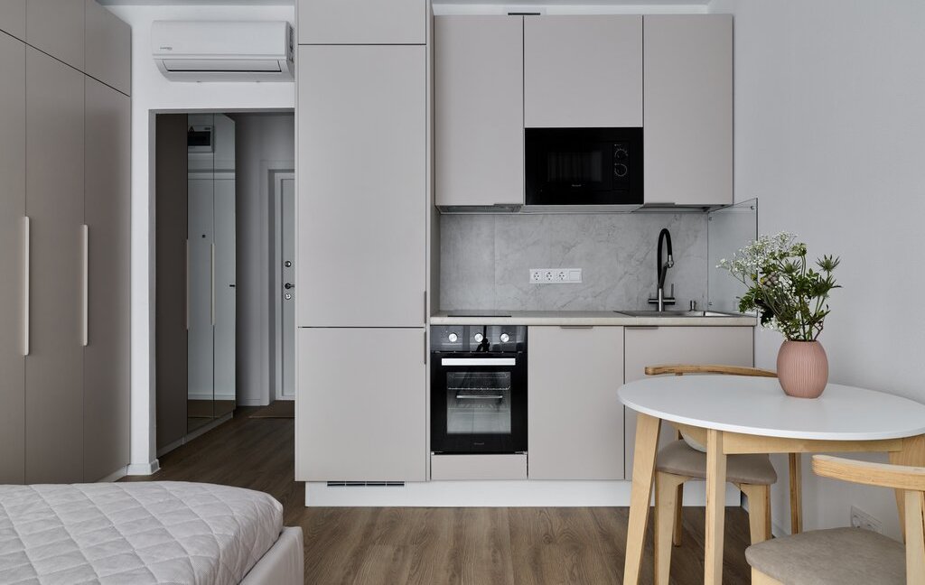 Без комиссии сдается компактная солнечная студия в приятных бежевых тонах на длительный срок (от 6 месяцев). В квартире есть все, что нужно для комфортного проживания: кондиционер, хорошая двуспальная кровать, вся необходимая бытовая техника (посудомоечная машина, духовой шкаф, большой холодильник, микроволновая печь, электрическая плита), гладильная доска, утюг; есть много мест для хранения.