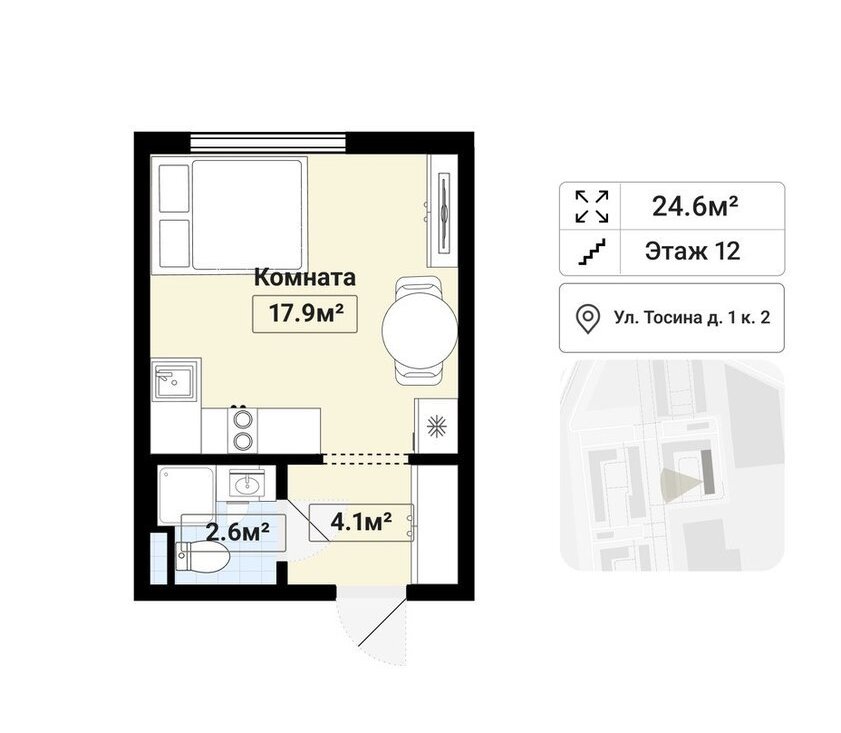 Квартира-студия: Санкт-Петербург, Тосина улица, 1к2 (24.6 м²)