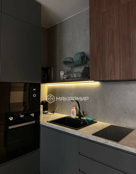 Кухня с современным гарнитуром, где всё продумано до мелочей: встроенный холодильник, керамическая поверхность, духовой шкаф, СВЧ, вытяжка и дополнительная подсветка.