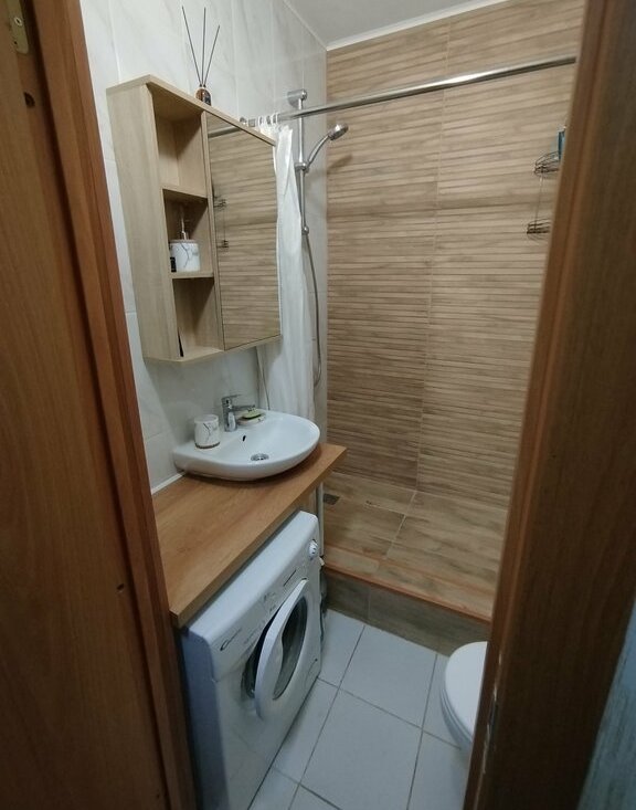 На полу постелен хороший, прочный линолеум. Все трубы в сан. узле, поменяны на более качественные, чем стояли от застройщика. Установлен бойлер, на время отключения гор. воды ( двухнедельный летний период).