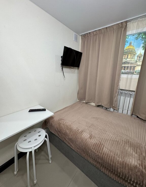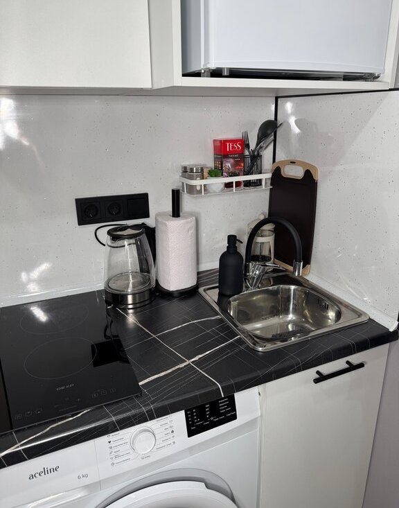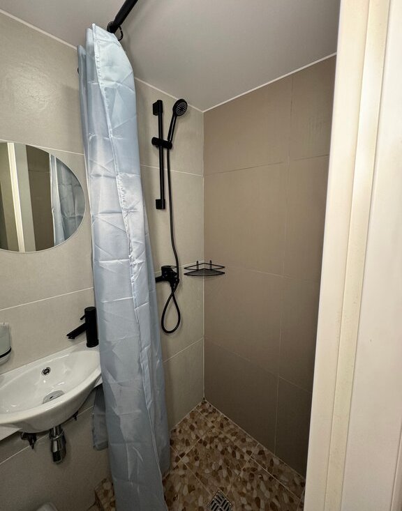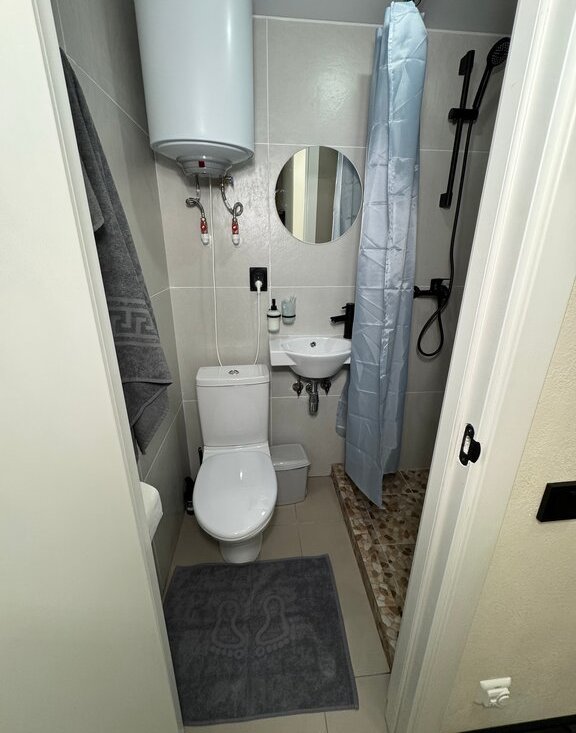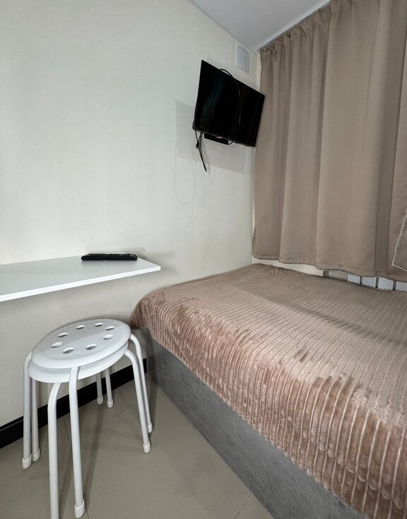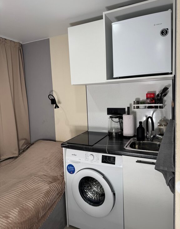 Внутри студии есть всё необходимое: тёплые полы, душ, отдельный санузел, кухонная зона с плитой и микроволновкой, телевизор и быстрый Wi-Fi. Пространство рассчитано на проживание одного человека — подойдёт для студента, специалиста или удалённого сотрудника.