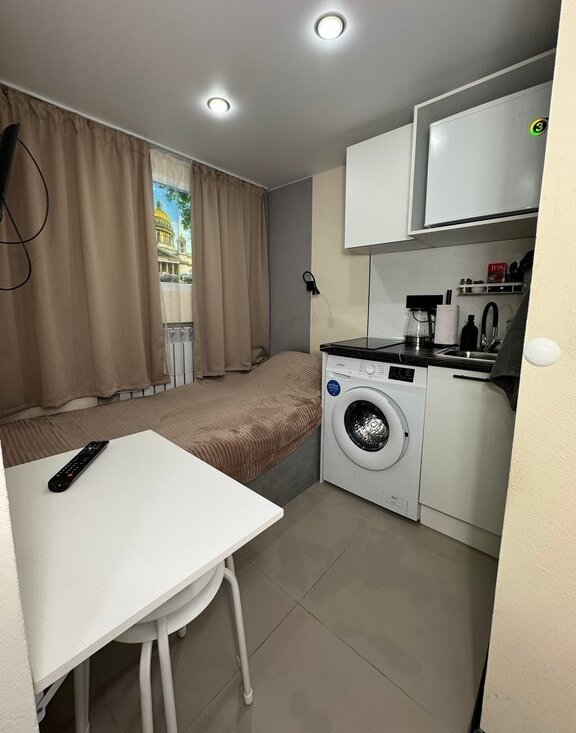 Студия расположена на -1 этаже, без окна, внутри аккуратного апарт-отеля с камерой наблюдения и чистой парадной.