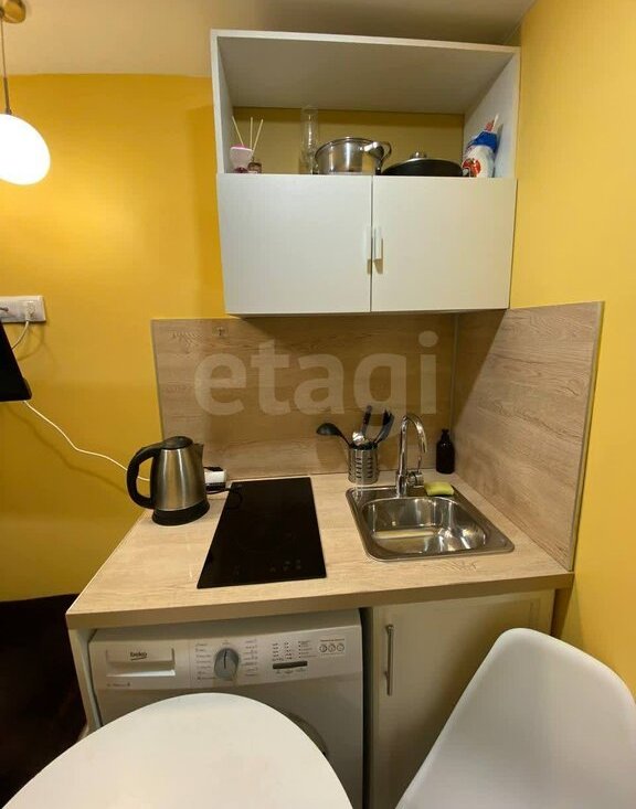 • Мини-кухня с варочной панелью, раковиной и посудой