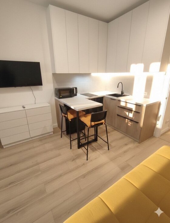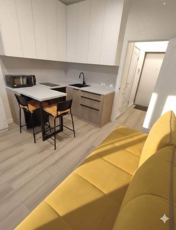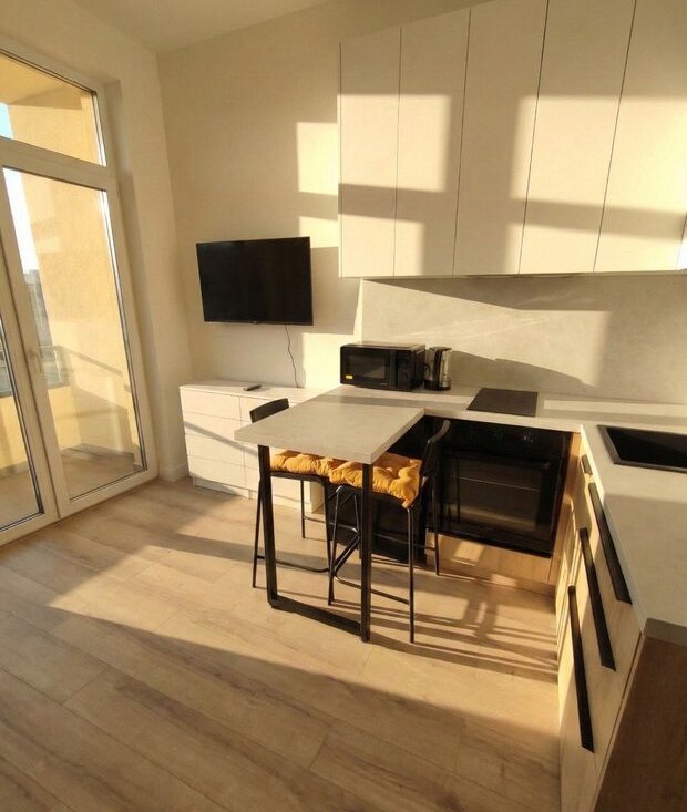 Квартира с дизайнерским ремонтом. Мебель и техника абсолютно новые. Вместительная кухня.