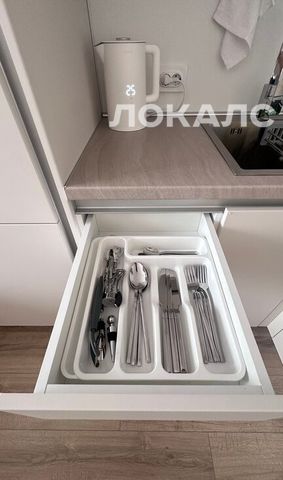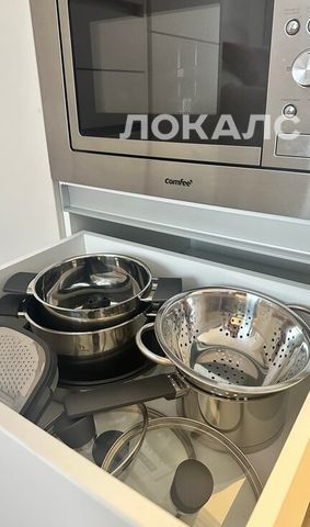 · Кухня: встроенный холодильник, индукционная плита, микроволновка, вытяжка, посуда (кастрюли, сковородки, столовые приборы)