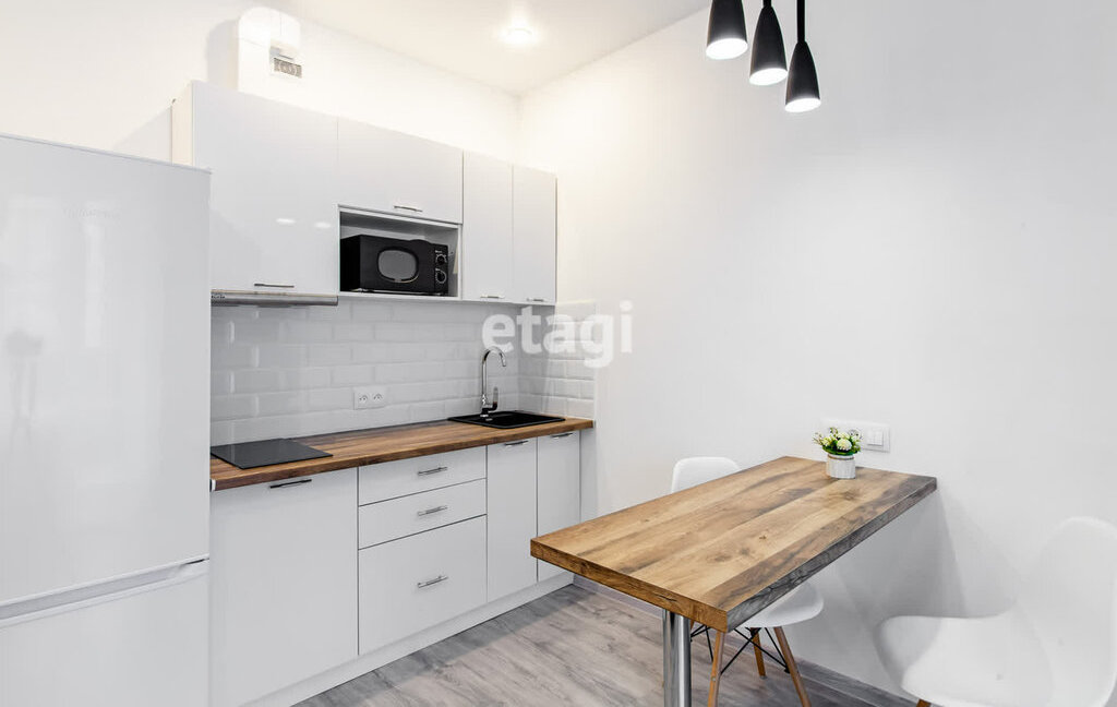 Кухонная зона с встроенной варочной панелью, вытяжкой, микроволновкой, холодильником. Стол и стулья.