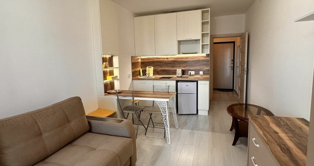 Сдается уютная студия в новом доме! в ЖК Солнечном городе огороженная территория Квартира находится на 7-м этаже 8-этажного монолитного дома, построенного в 2021 году. Общая площадь квартиры составляет 25 кв. м, жилая площадь — 16 кв. м, площадь кухни — 4 кв. м. Окна выходят во двор, поэтому в квартире тихо и спокойно.Без животных