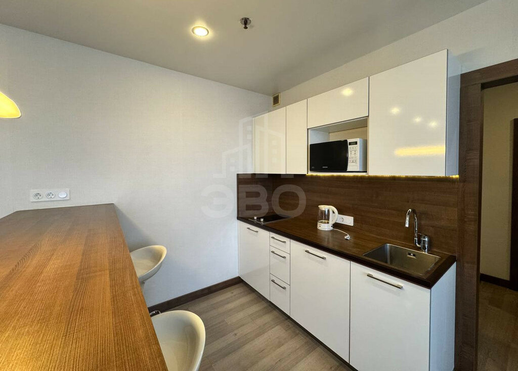• Кухонная зона со встроенной техникой: варочная панель с вытяжкой, холодильник, микроволновка, чайник, стиральная машина