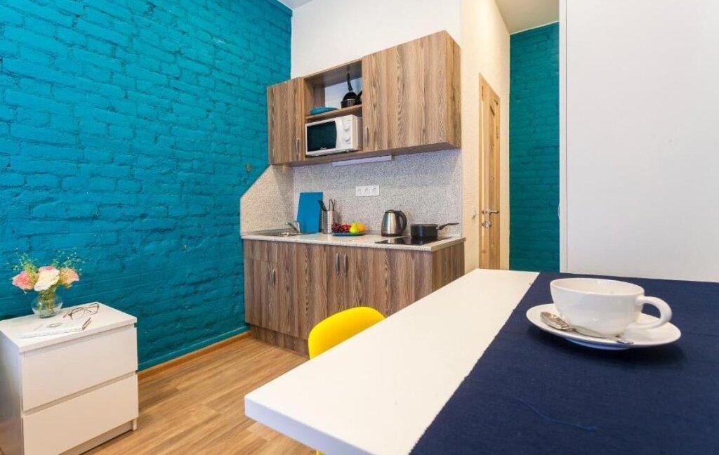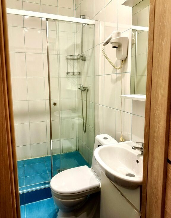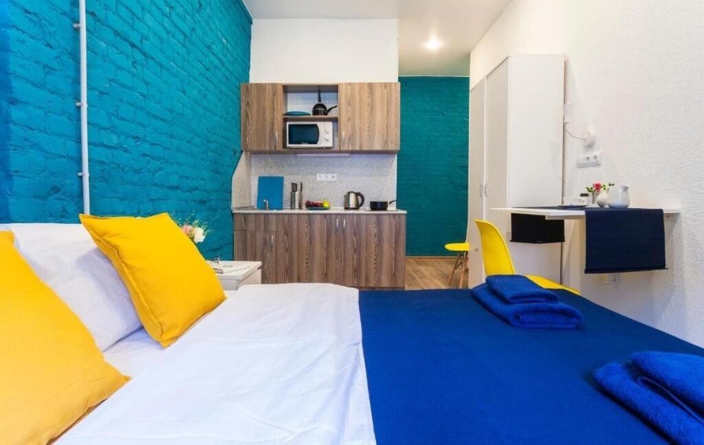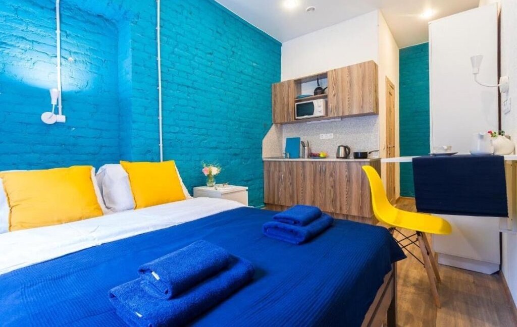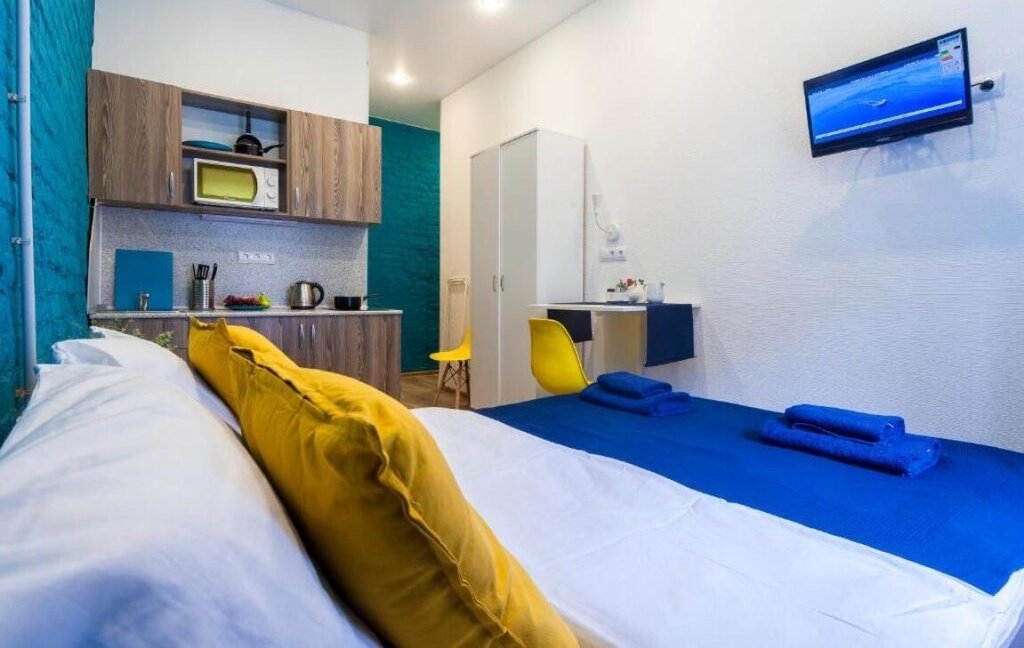 Есть все, что необходимо для проживания (сан.узел в номере)- студия с окнами во двор, за железной дверью. Большая кровать. Есть интернет.