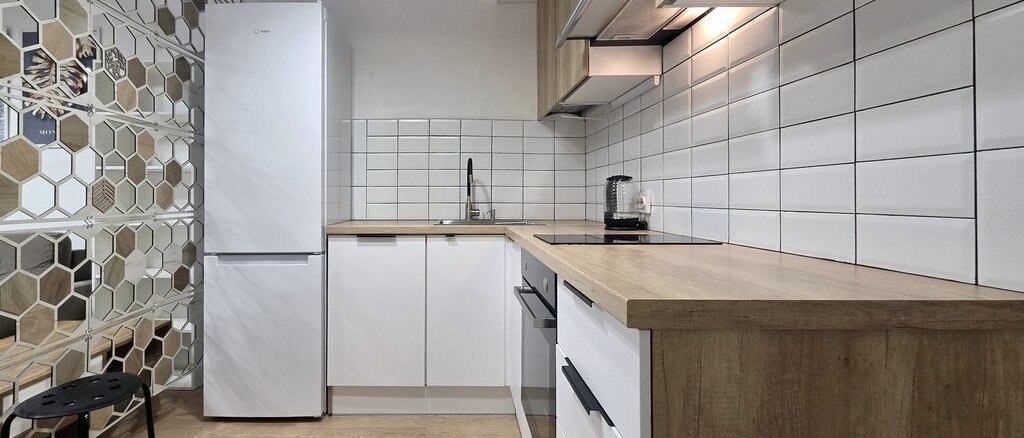 - на кухне - гарнитур с бытовой техникой (варочная панель с вытяжкой, духовой шкаф, холодильник), табурет;