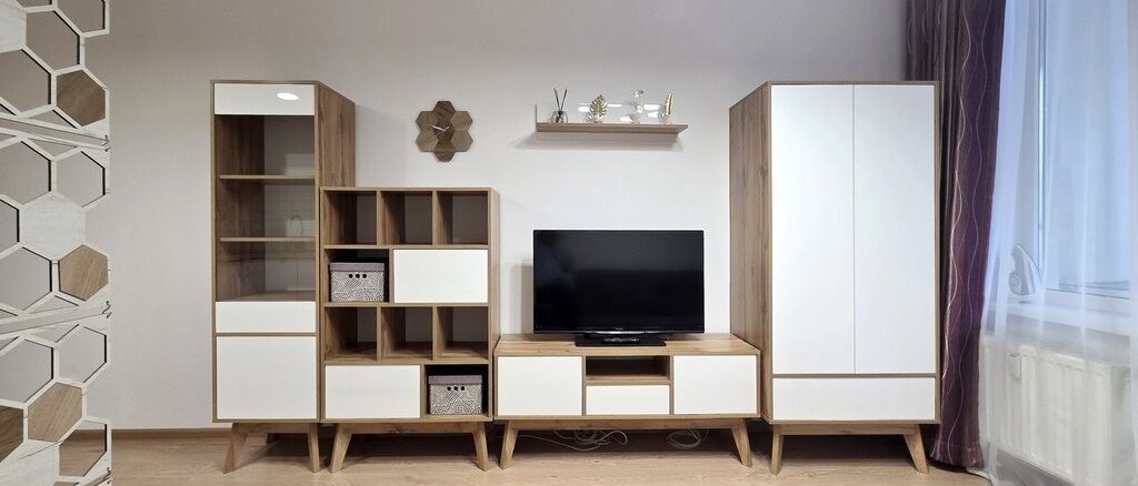 - в комнате - раскладной диван, мебельная стенка с телевизором, стеллаж, журнальный столик с пуфиком;