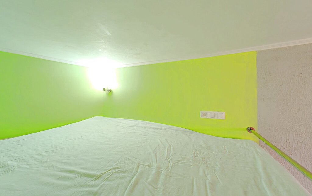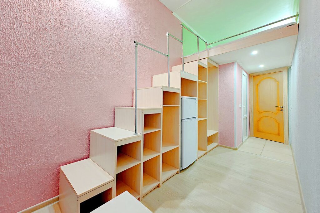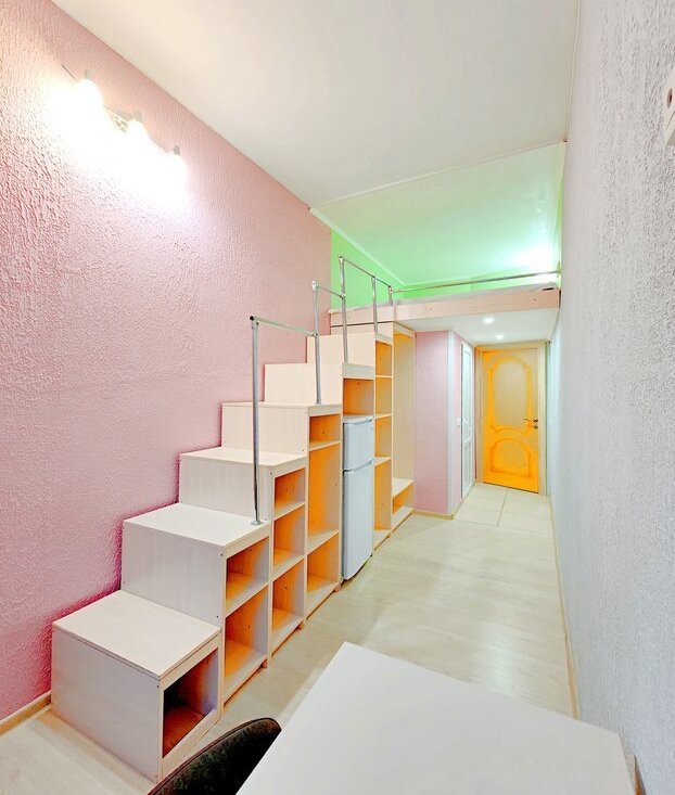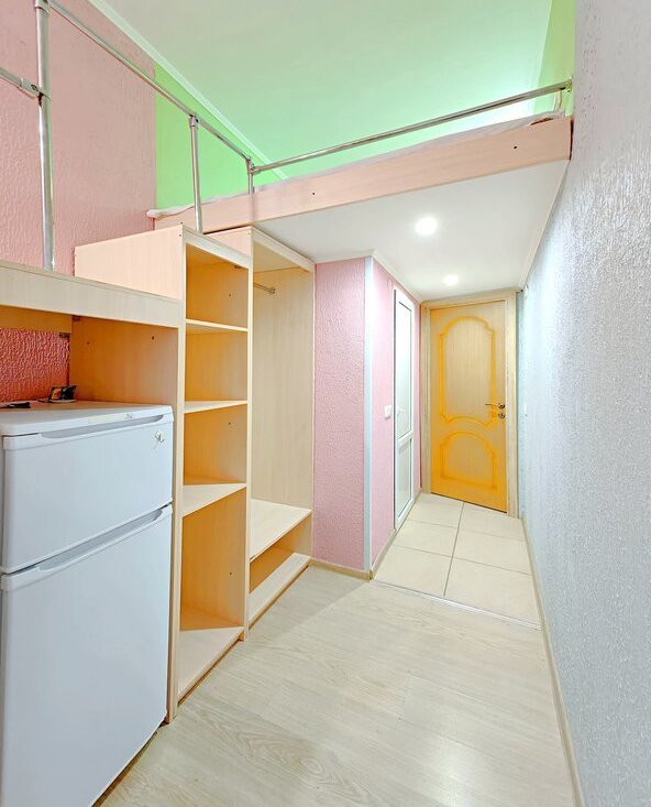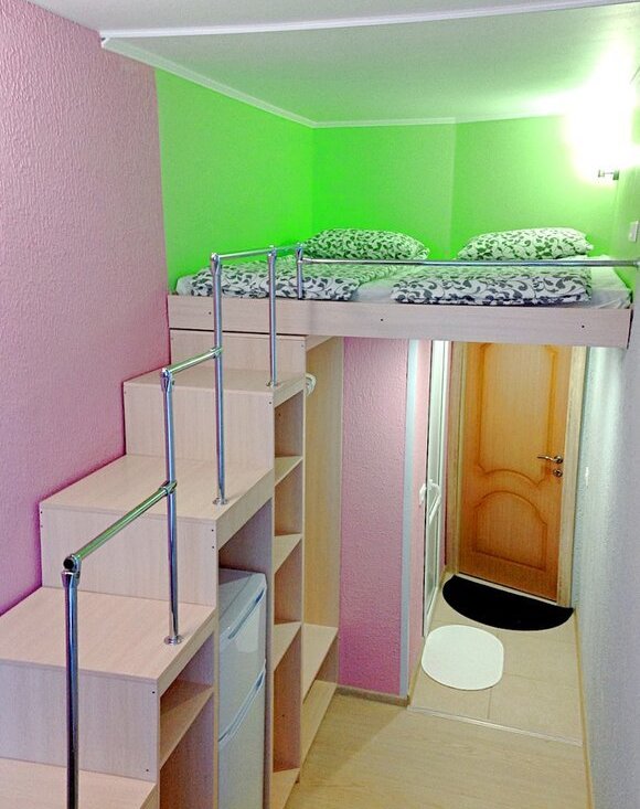 -Евроремонт, большая кровать наверху, внизу стол+стул, места для хранения, холодильник.