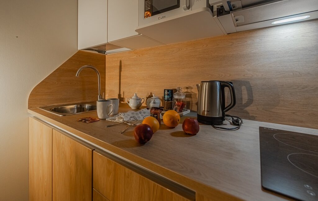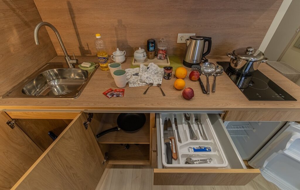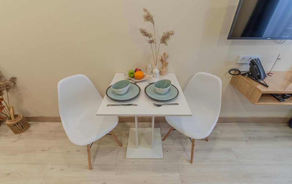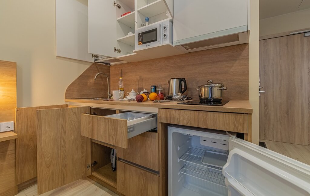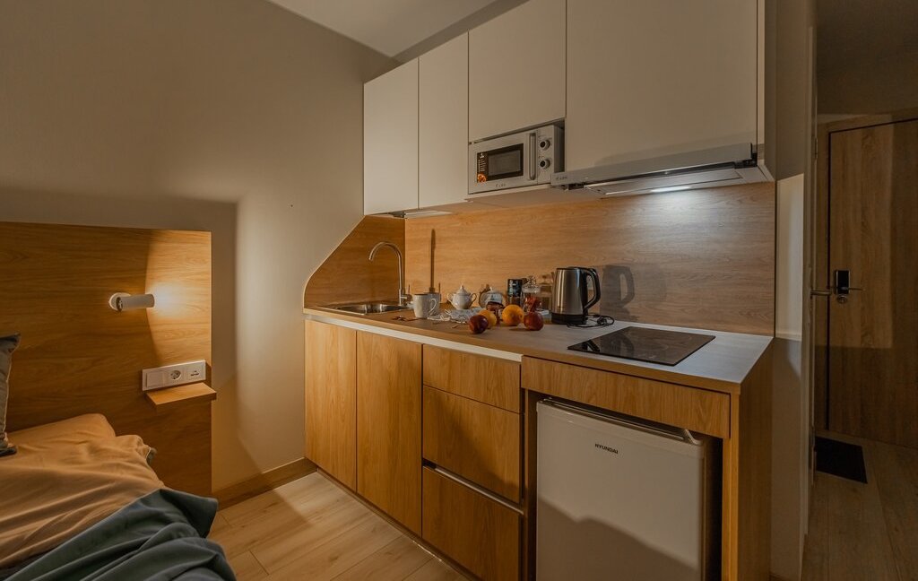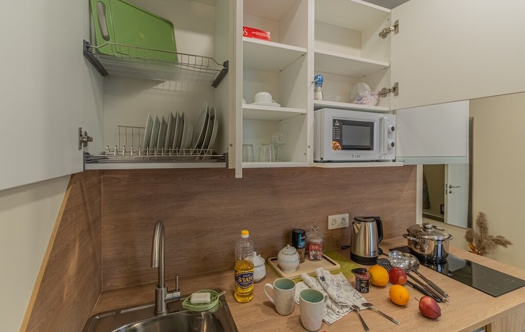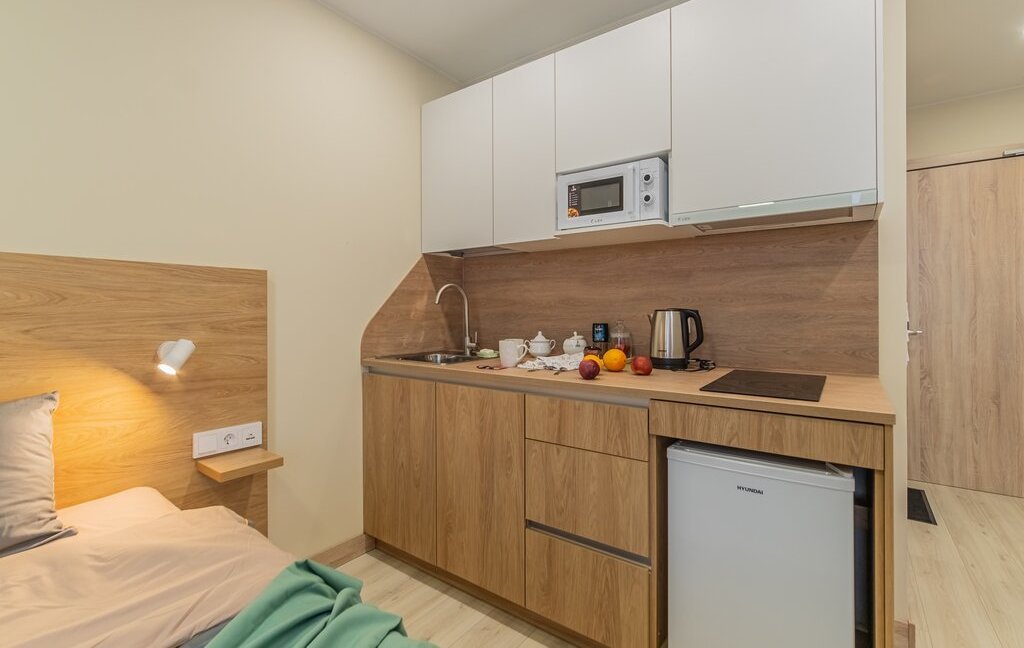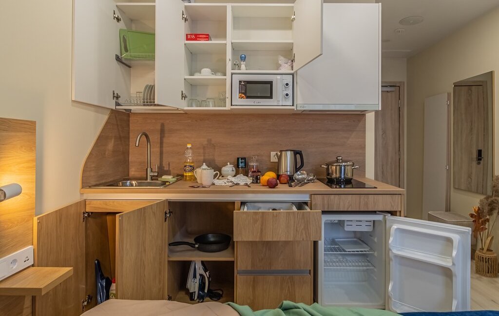 - обеденная зона (холодильник, чайник, микроволновка, варочная панель, столовая группа, посуда на 2 персоны, стол со стульями)