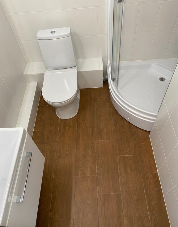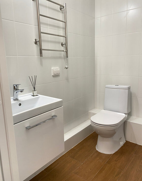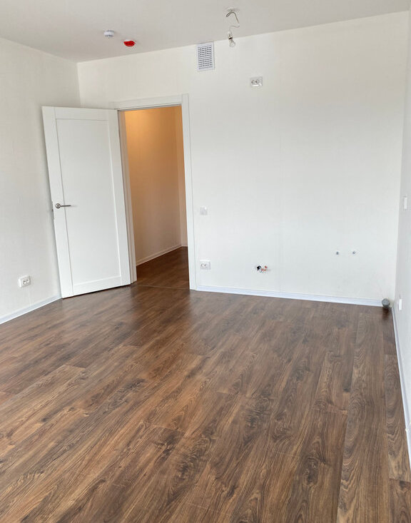 В квартире выполнена полная отделка "Comfort Wood" из качественных материалов: прочный ламинат, фактурные белые обои, керамическая плитка в ванной.