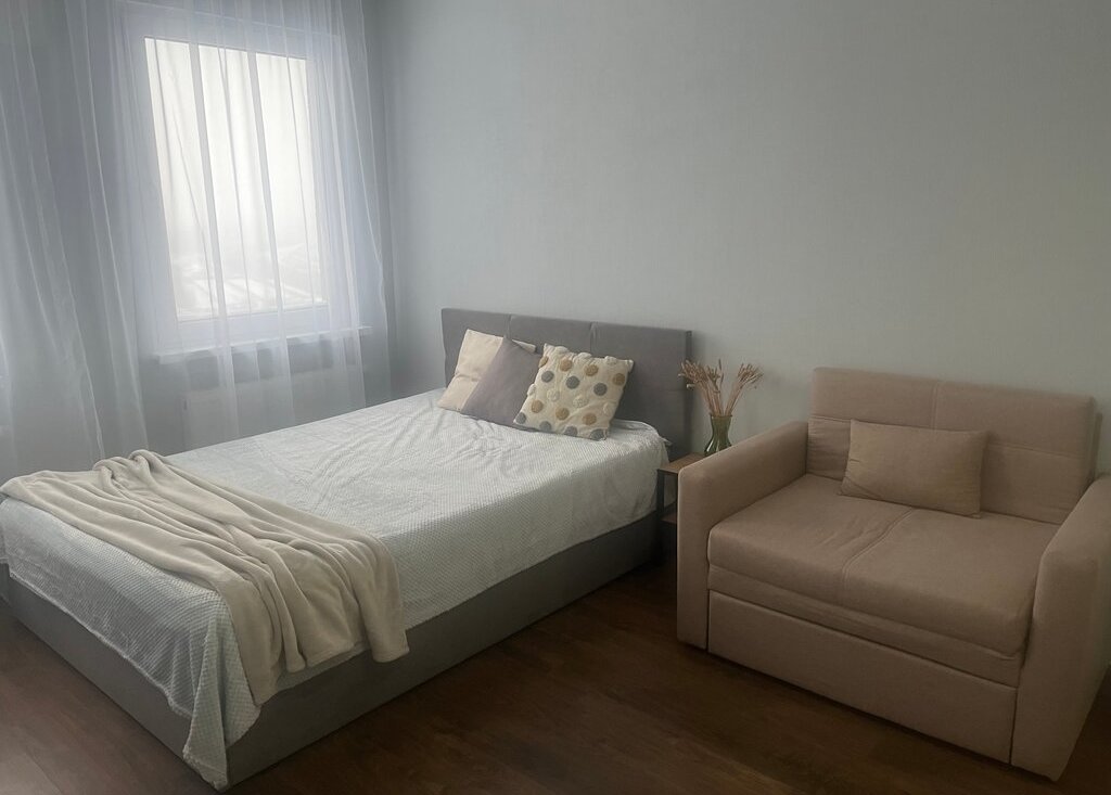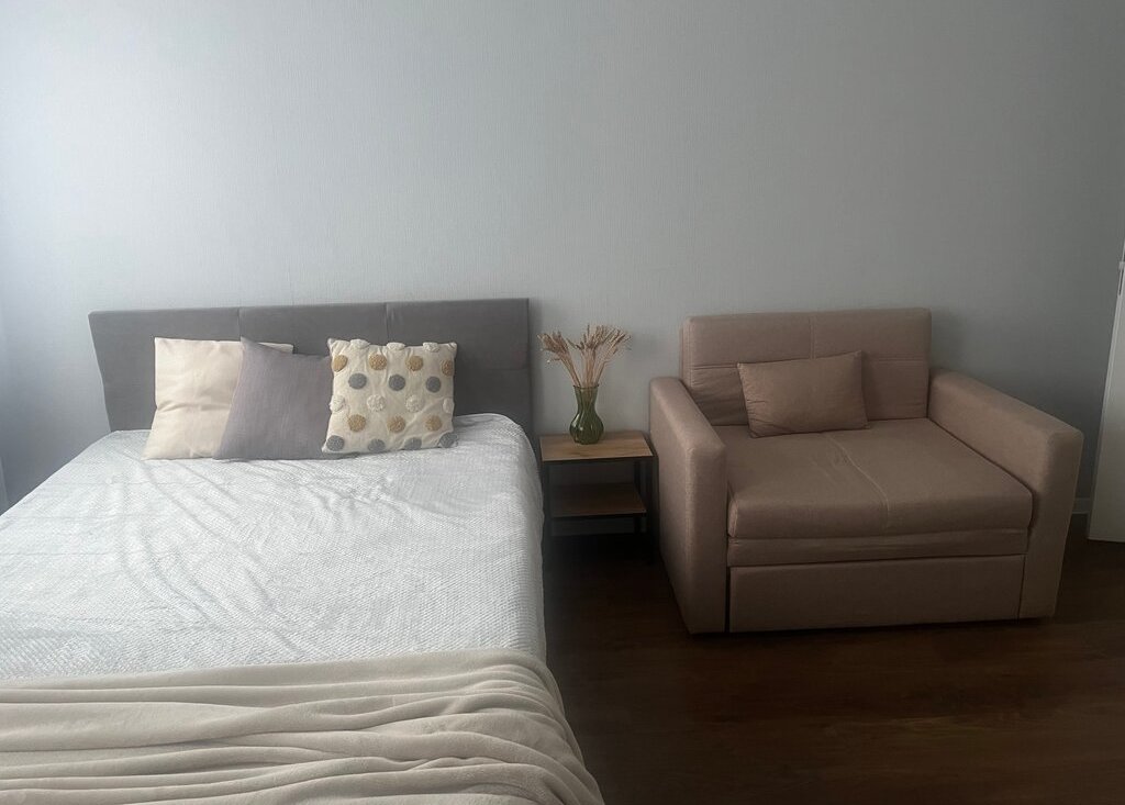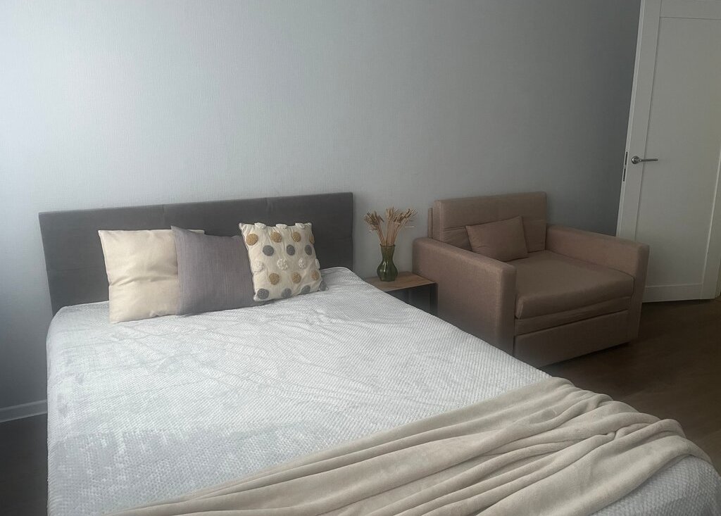 Просторная комната оборудована двуспальной кроватью и кресло-диваном. Есть кухонный гарнитур с электрической плитой, чайником и микроволновой печью. (Холодильник будет в ближайшие дни).