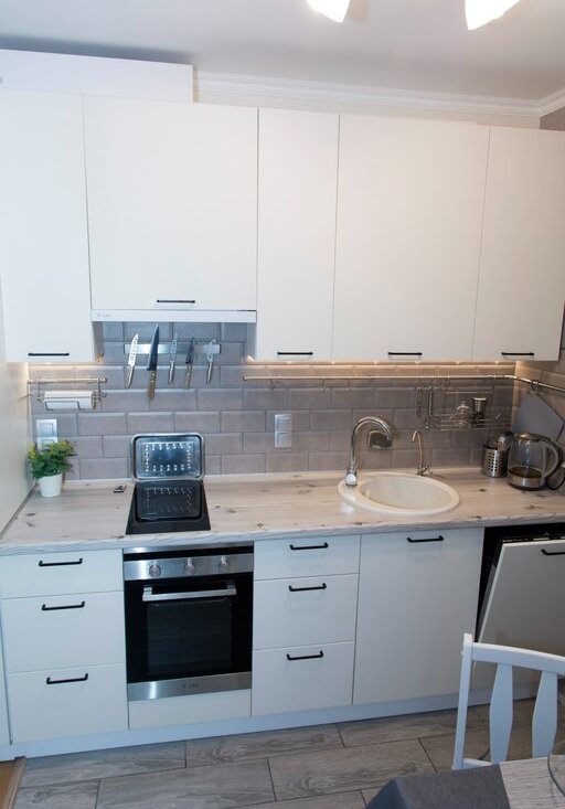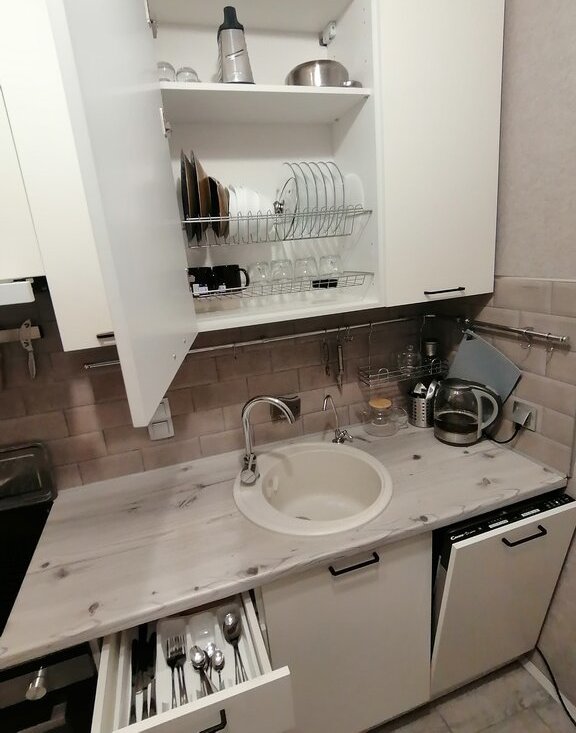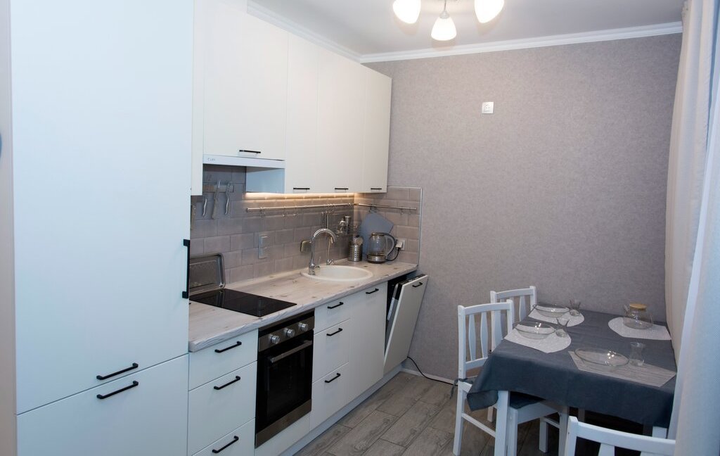 Кухонная зона: тёплый пол, варочная поверхность, вытяжка, духовой шкаф, чайник, холодильник, микроволновая печь, столовые принадлежности, питьевой стационарный фильтр, посудомоечная машина.