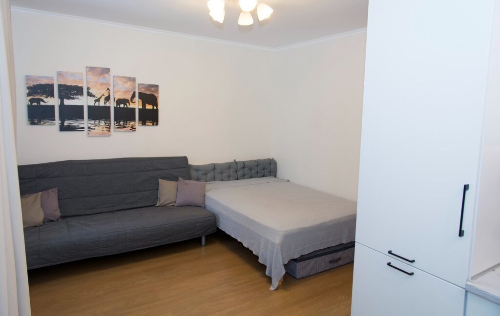 Жилая зона: раскладной диван, кровать, журнальный столик, телевизор.